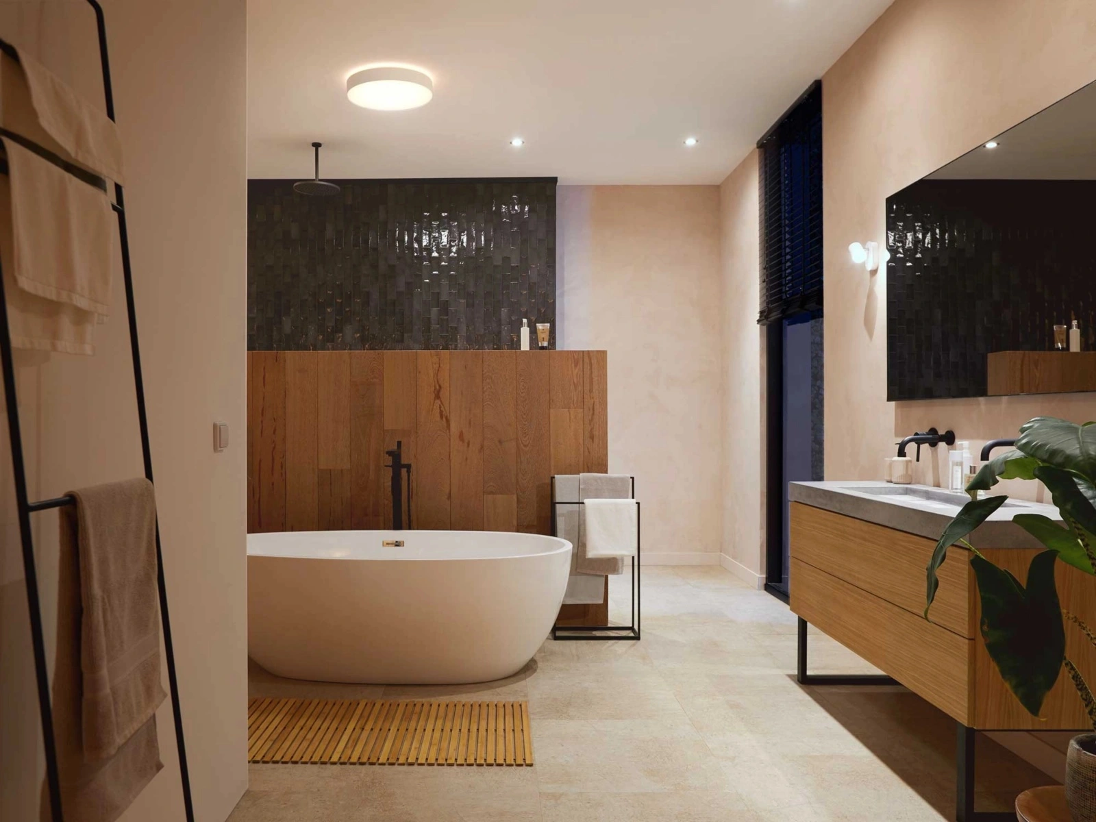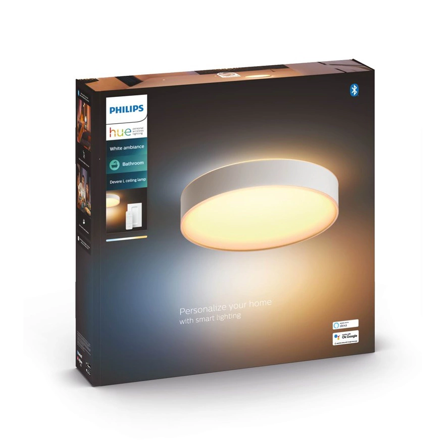 Stropní světlo v koupelně HUE Devere LED uznávaný a respektovaný v oboru osvětlení Philips. Plafón vybavený integrovaným světelným zdrojem LED z 33,5W a velmi účinný světelný výkon - 4300 lm. Lampa poskytuje dostatečné bílé světlo s nastavitelnou teplotou barvy od příjemně teplé přes neutrální až po studenou, což usnadňuje provádění každodenních činností. Vysoký stupeň vodotěsnosti zaručený krytím IP44 umožňuje instalaci v místnostech s vysokou vlhkostí, jako jsou koupelny. Stropní svítidlo HUE Devere může fungovat samostatně nebo jako součást systému chytrého osvětlení po připojení k můstku Hue Bridge. Snadné zapínání a vypínání světel, stmívání, rozjasňování a výběr z různých světelných scén.