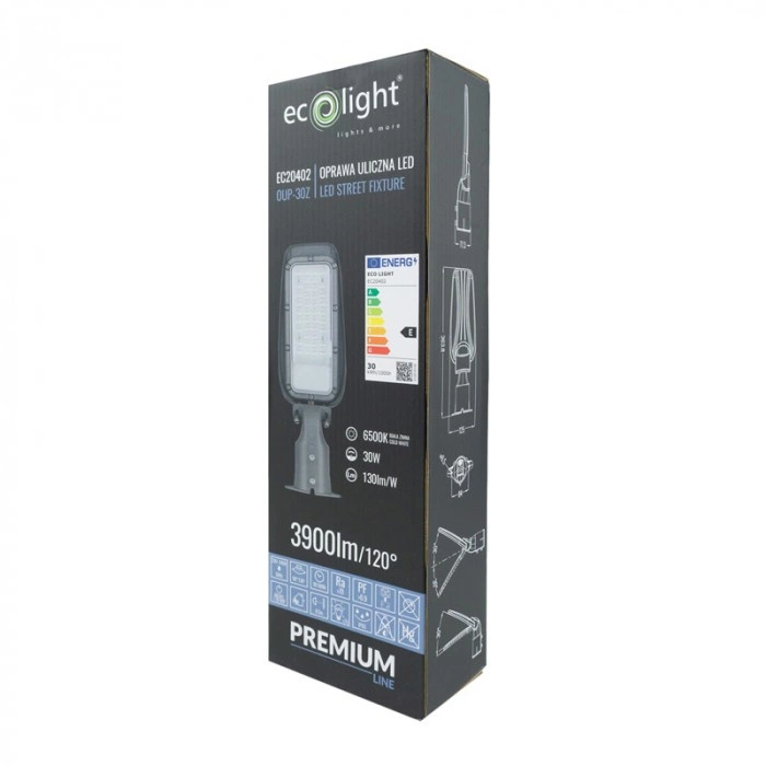 30W pouliční lampa LED je vysoce kvalitní řešení osvětlení od společnosti Ecolight, které je ideální pro venkovní použití ve městech a na vozovkách. S výkonem 30 W a působivou světelnou účinností 130 lm/W poskytuje lampa světelný tok 3900 lm, což zajišťuje jasné a účinné osvětlení cílové oblasti. Díky studené barvě světla 6500 K se dokonale hodí do prostor, které vyžadují intenzivní osvětlení. Integrovaný zdroj LED s vysokým indexem podání barev Ra 80 zaručuje dlouhou provozní dobu a nízkou spotřebu energie.