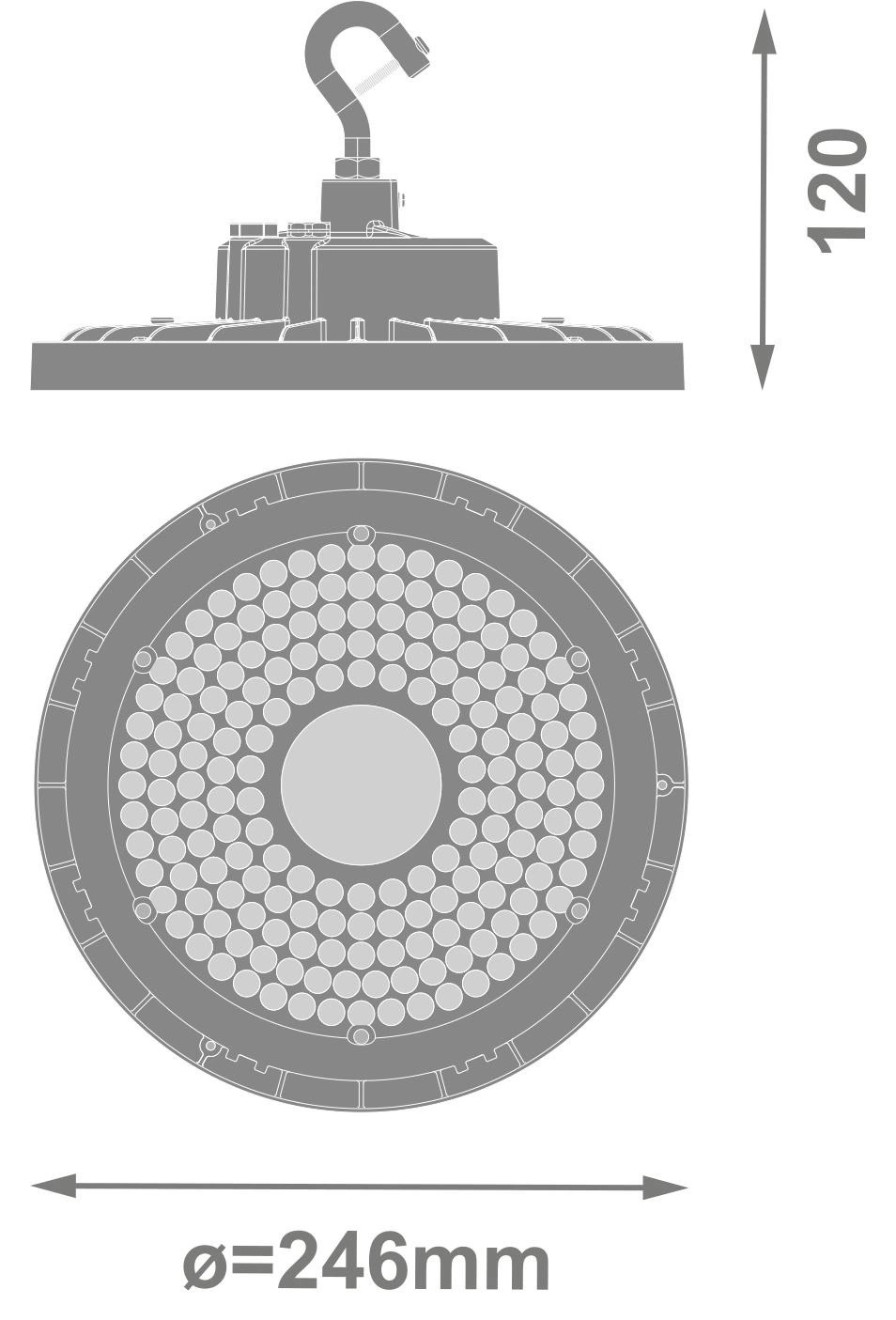 Představujeme nejmodernější průmyslové svítidlo LED s výkonem 120 W a světelným tokem 21100 lumenů. Poskytuje vynikající osvětlení s účinností 176 lm/W a neutrální bílou barvou světla 4000 K. Je vyrobeno z odolného hliníku a vyznačuje se vysokým stupněm krytí IP66 a IK10, takže je ideální pro náročné průmyslové prostředí.
