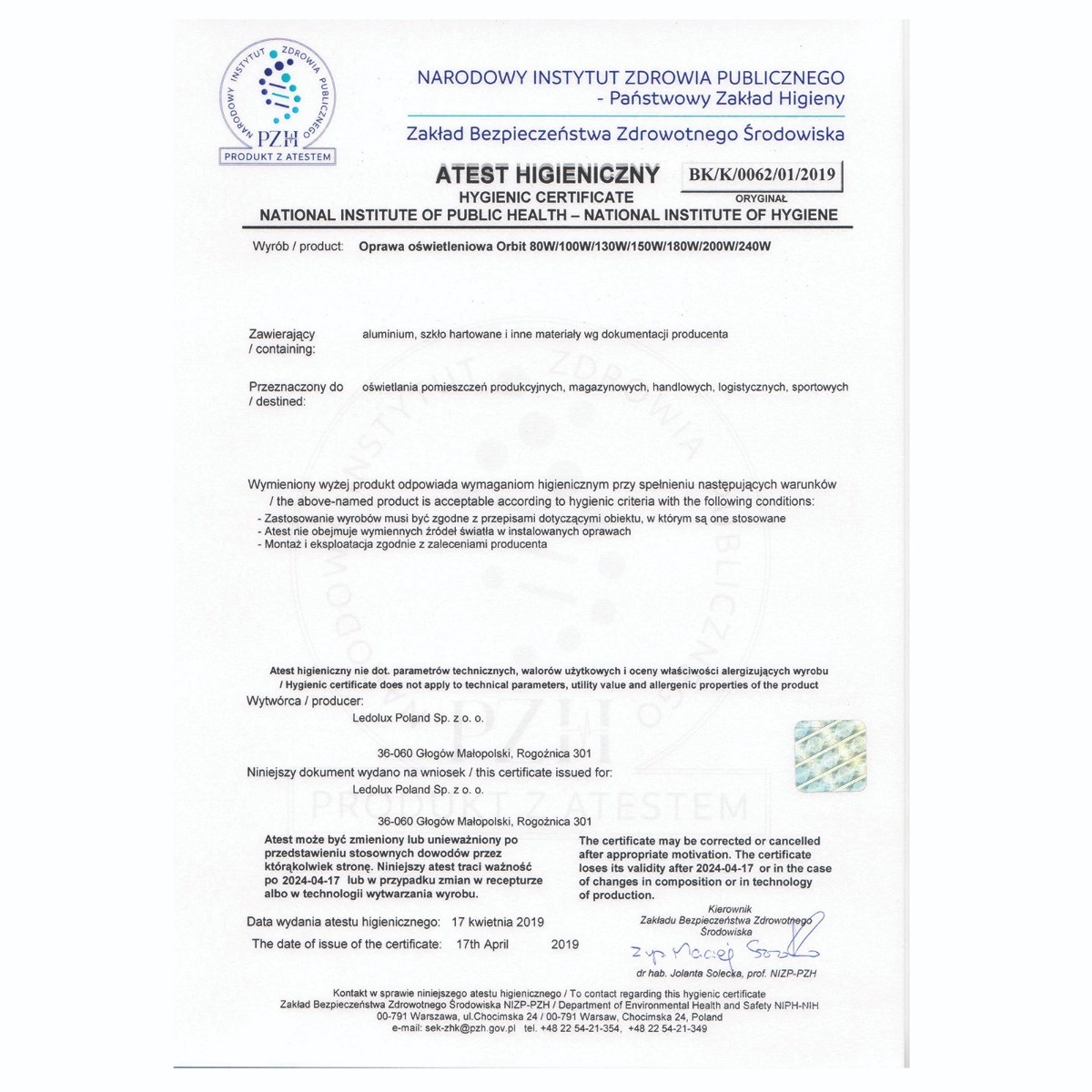 Svítidlo má certifikát CE, RoHs a hygienický certifikát PZH (Polský národní hygienický institut) ORBIT splňuje platné bezpečnostní normy.