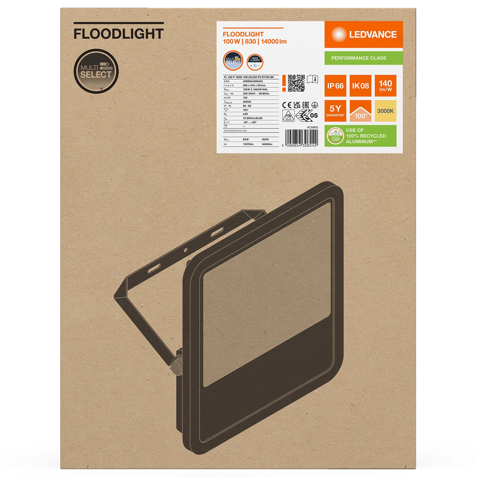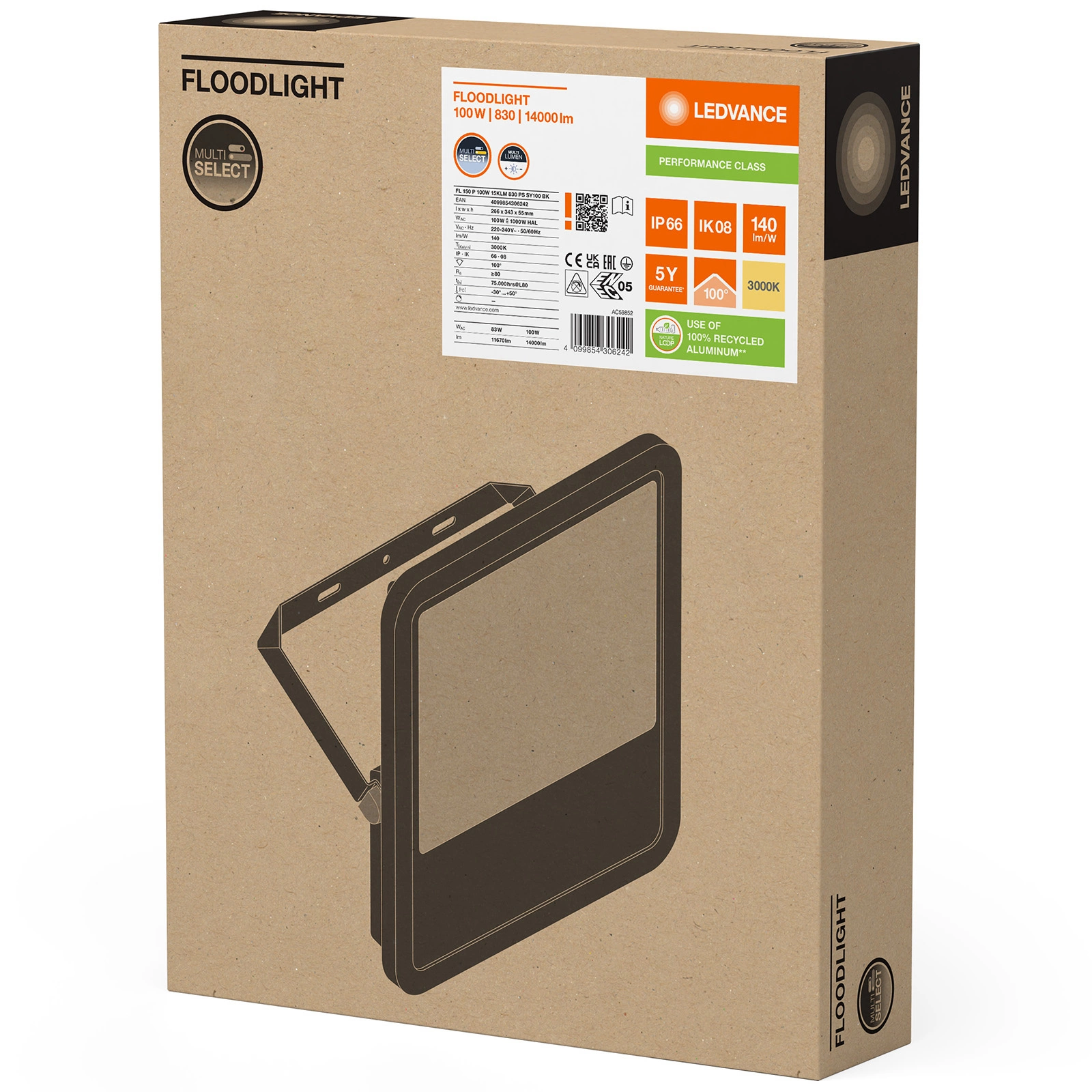 Reflektor LEDVANCE je vybaven energeticky úsporným LED světelným zdrojem z 100W. Lampy vyzařuje teplé světlo světlo s barevnou teplotou 3000K který umožňuje světelný tok až do hodnoty 14000lm. Tvrzené matné sklo zajišťuje rovnoměrné šíření světla. LEDVANCE LED halogen je inovativní zařízení, které má své využití ve venkovním prostředí, nejlépe se hodí k osvětlení garáží, fasád budov nebo příjezdových cest.
