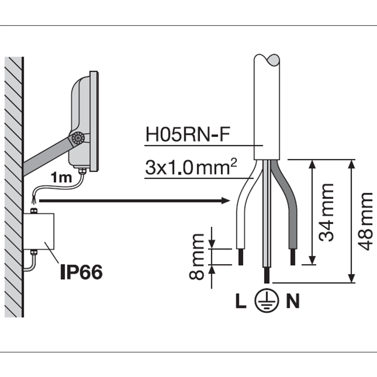 - Flexibilní, instalovaný z výroby 1 m dlouhý kabel (H05RN-F), 3 x 1,0 mm² s měděnými koncovkami