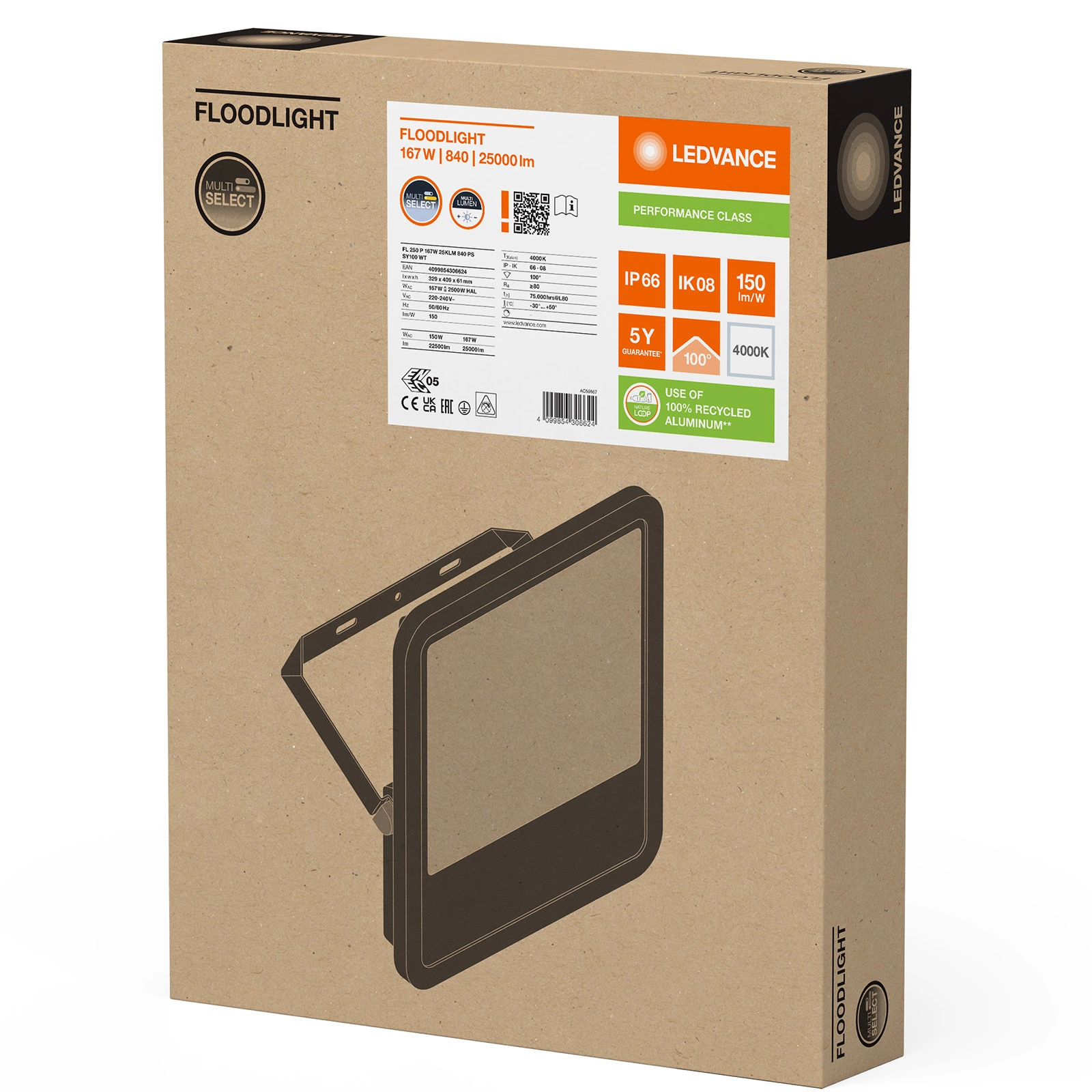 Reflektor LEDVANCE je vybaven energeticky účinným LED světelným zdrojem z 167W. Lampy vyzařuje neutrální světlo s barevnou teplotou 4000K který umožňuje světelný tok až do hodnoty 25000lm. Tvrzené matné sklo zajišťuje rovnoměrné šíření světla. LEDVANCE LED halogen je inovativní zařízení, které má své využití ve venkovním prostředí, nejlépe se hodí k osvětlení garáží, fasád budov nebo příjezdových cest.
