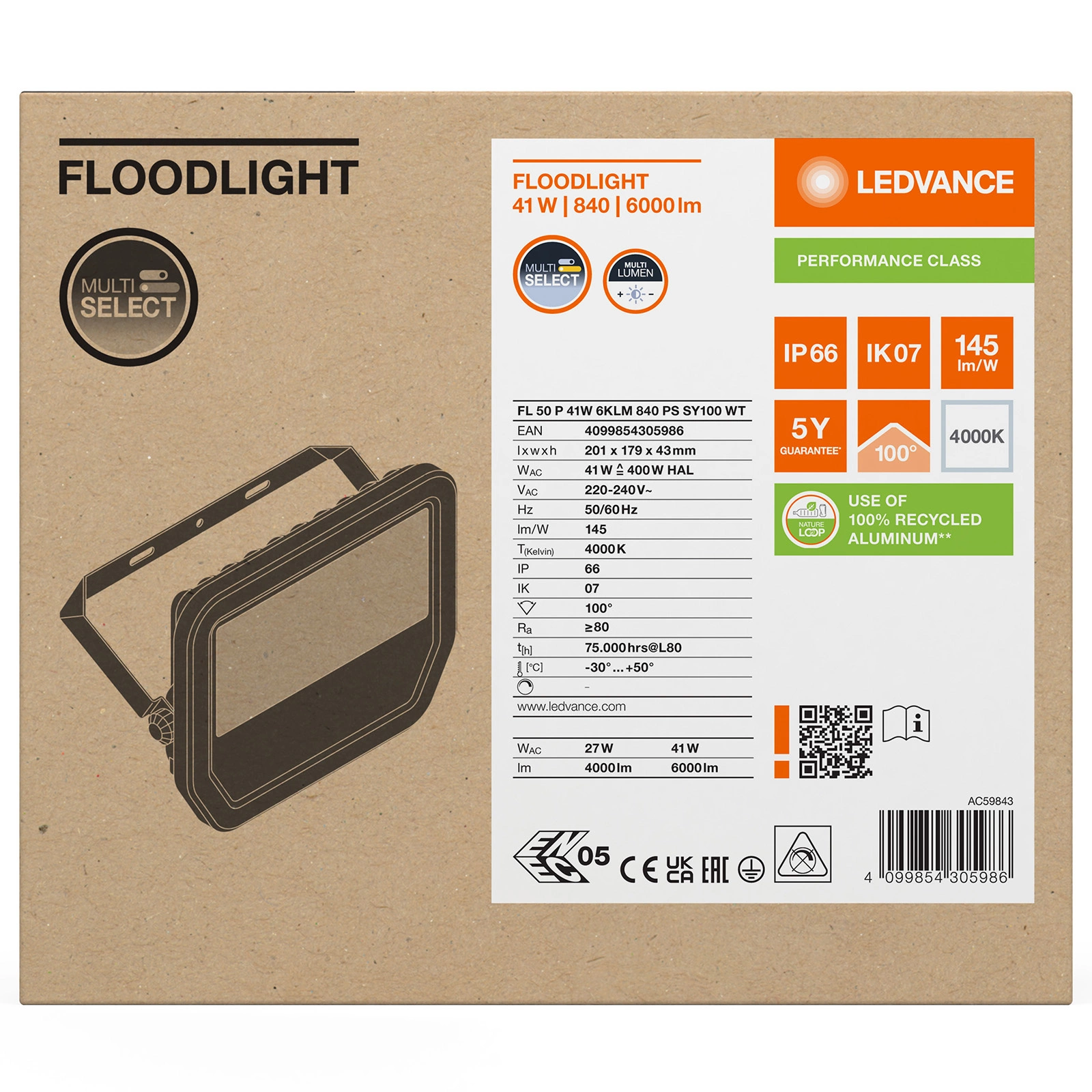 Reflektor LEDVANCE je vybaven energeticky úsporným LED světelným zdrojem z 41W. Lampy vyzařuje neutrální světlo s barevnou teplotou 4000K který umožňuje světelný tok až do hodnoty 6000 lm. Tvrzené matné sklo zajišťuje rovnoměrné šíření světla. LEDVANCE LED halogen je inovativní zařízení, které má své využití ve venkovním prostředí, nejlépe se hodí k osvětlení garáží, fasád budov nebo příjezdových cest.