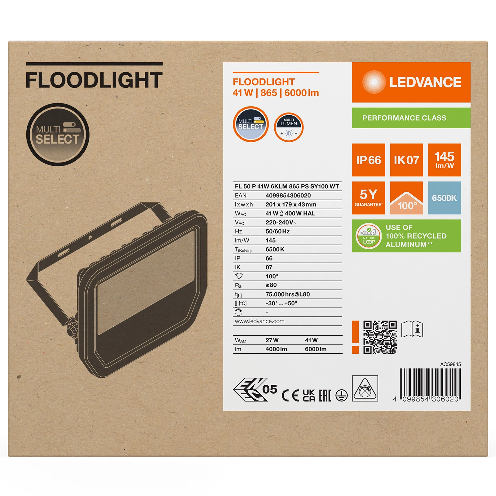 Reflektor LEDVANCE je vybaven energeticky úsporným LED světelným zdrojem z 41W. Lampy vyzařuje chlad světlo s barevnou teplotou 6500K který umožňuje světelný tok až do hodnoty 6000 lm. Tvrzené matné sklo zajišťuje rovnoměrné šíření světla. LEDVANCE LED halogen je inovativní zařízení, které má své využití ve venkovním prostředí, nejlépe se hodí k osvětlení garáží, fasád budov nebo příjezdových cest.