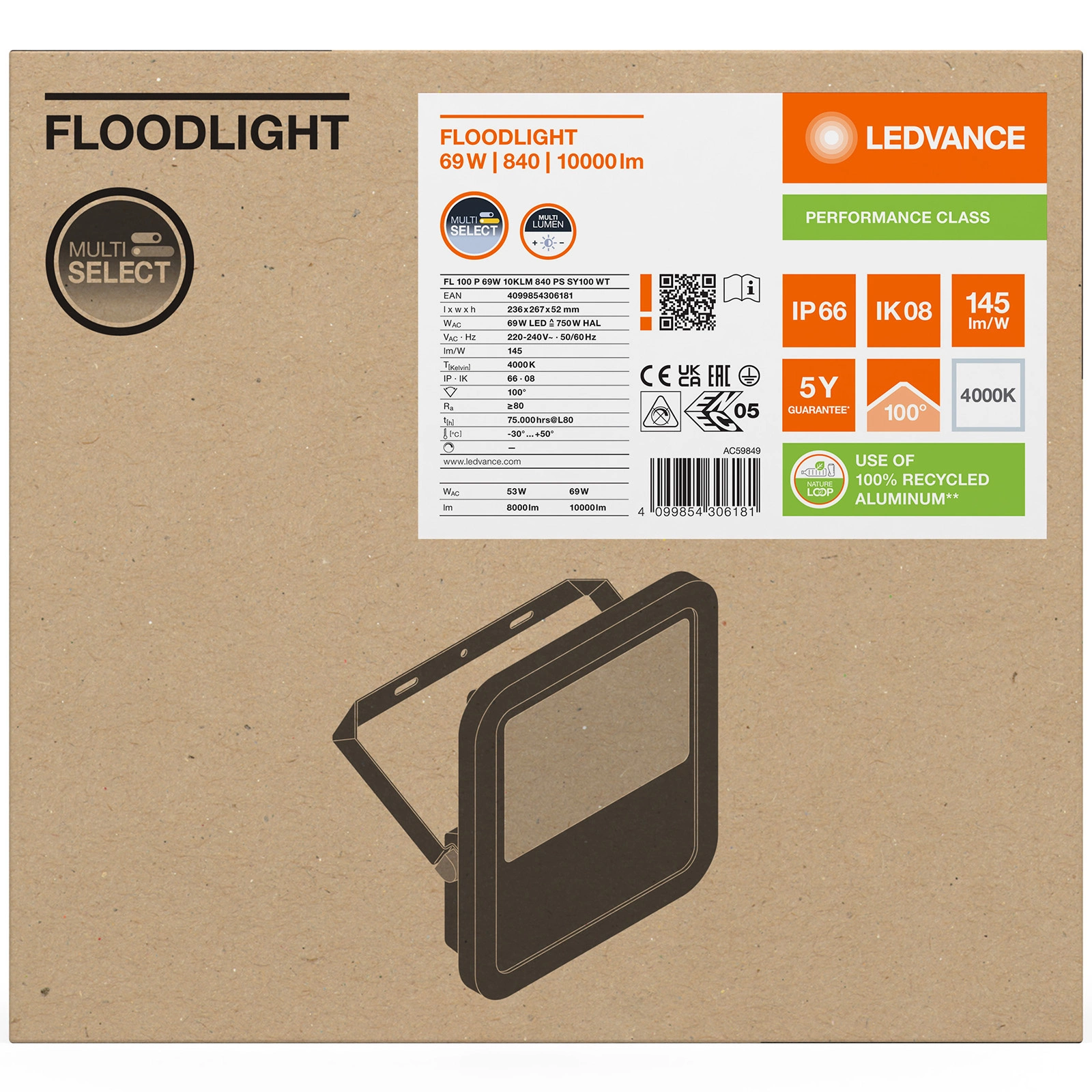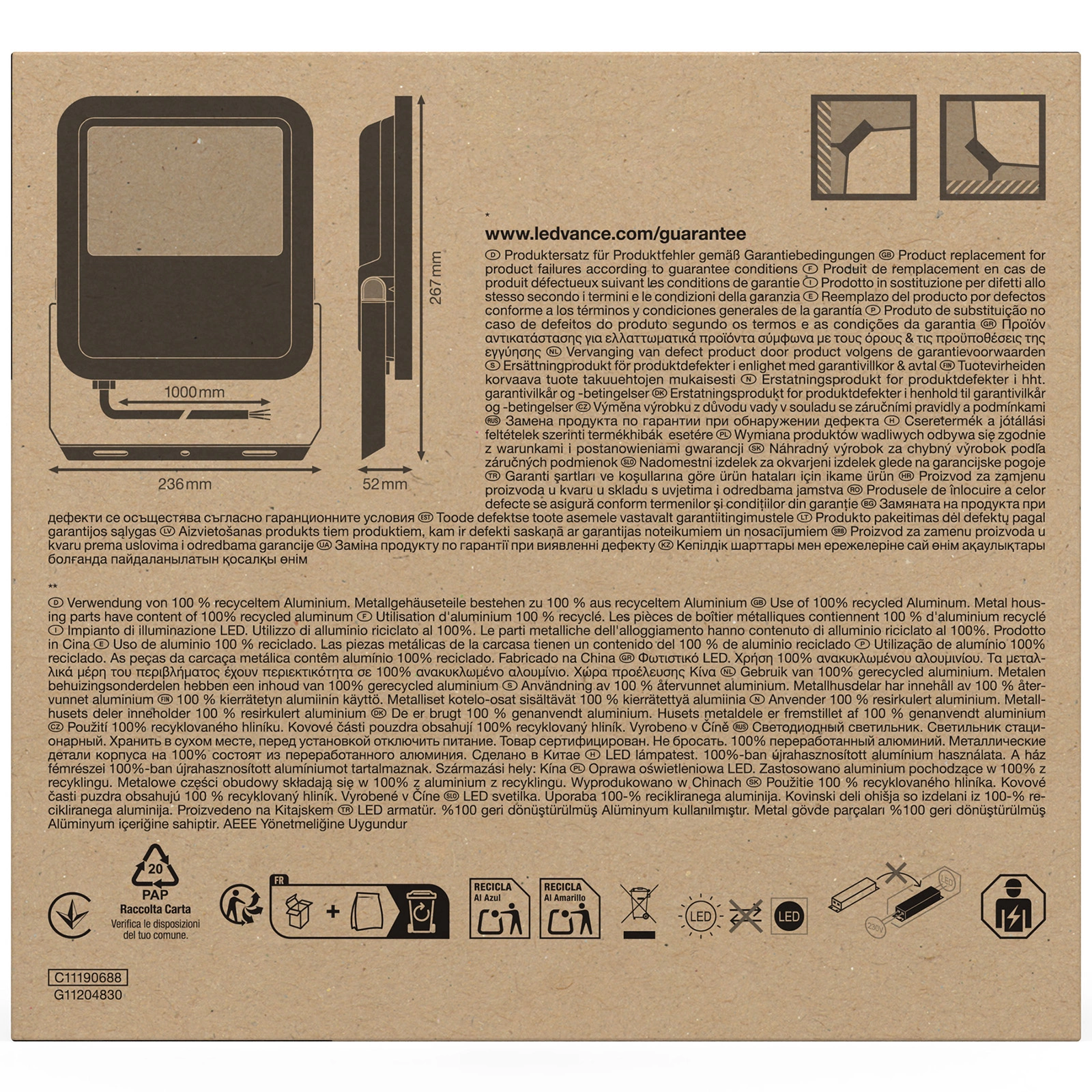 Reflektor LEDVANCE je vybaven energeticky účinným LED světelným zdrojem z 69W. Lampy vyzařuje neutrální světlo s barevnou teplotou 4000K který umožňuje světelný tok až do hodnoty 10000lm. Tvrzené matné sklo zajišťuje rovnoměrné šíření světla. LEDVANCE LED halogen je inovativní zařízení, které má své využití ve venkovním prostředí, nejlépe se hodí k osvětlení garáží, fasád budov nebo příjezdových cest.