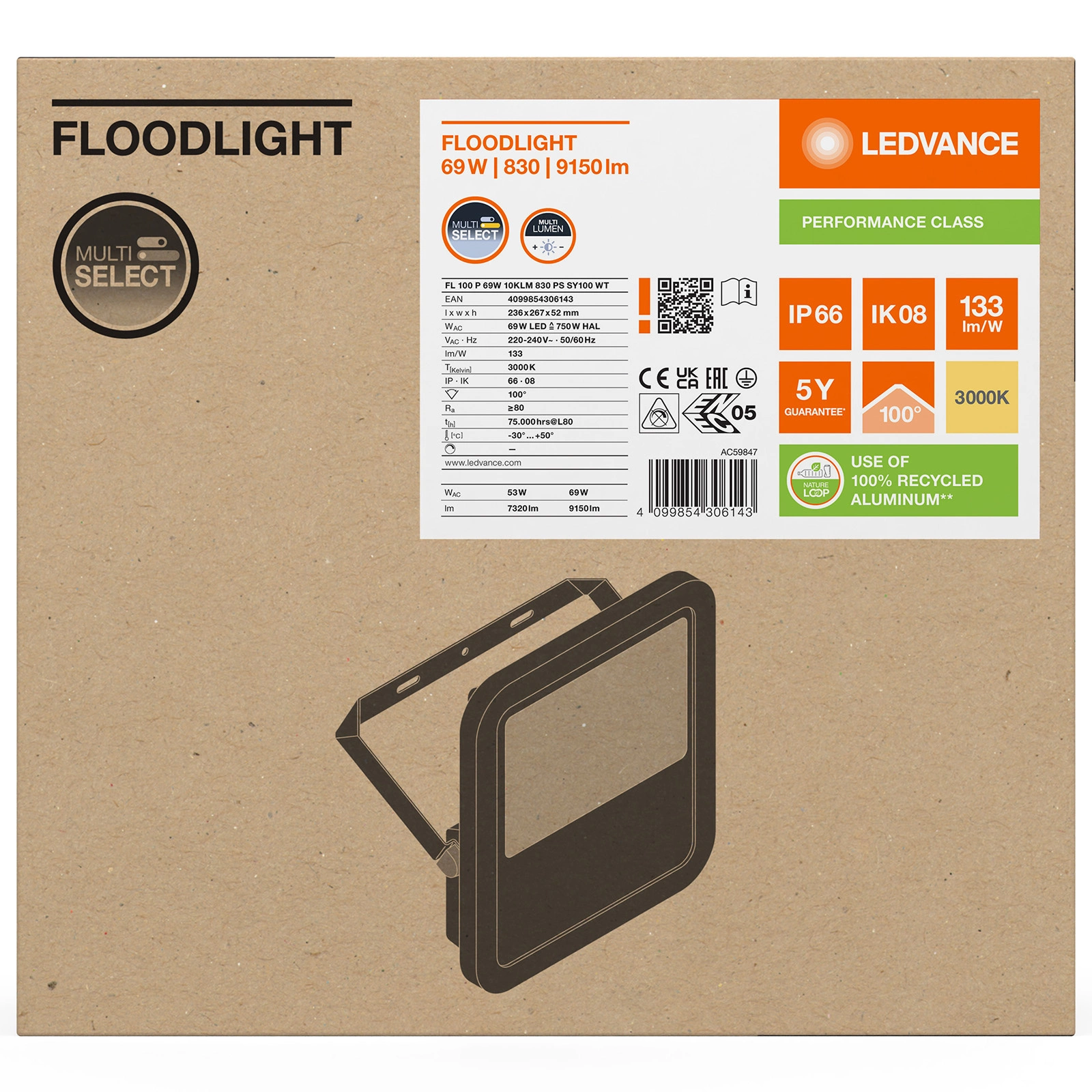 Reflektor LEDVANCE je vybaven energeticky účinným LED světelným zdrojem z 69W. Lampy vyzařuje teplé světlo světlo s barevnou teplotou 3000K který umožňuje světelný tok až do hodnoty 9150lm. Tvrzené matné sklo zajišťuje rovnoměrné šíření světla. LEDVANCE LED halogen je inovativní zařízení, které má své využití ve venkovním prostředí, nejlépe se hodí k osvětlení garáží, fasád budov nebo příjezdových cest.