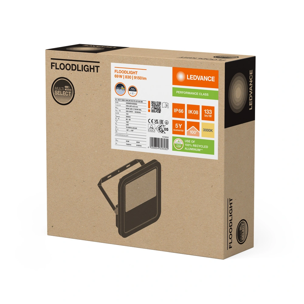 Reflektor LEDVANCE je vybaven energeticky účinným LED světelným zdrojem z 69W. Lampy vyzařuje teplé světlo světlo s barevnou teplotou 3000K který umožňuje světelný tok až do hodnoty 9150lm. Tvrzené matné sklo zajišťuje rovnoměrné šíření světla. LEDVANCE LED halogen je inovativní zařízení, které má své využití ve venkovním prostředí, nejlépe se hodí k osvětlení garáží, fasád budov nebo příjezdových cest.