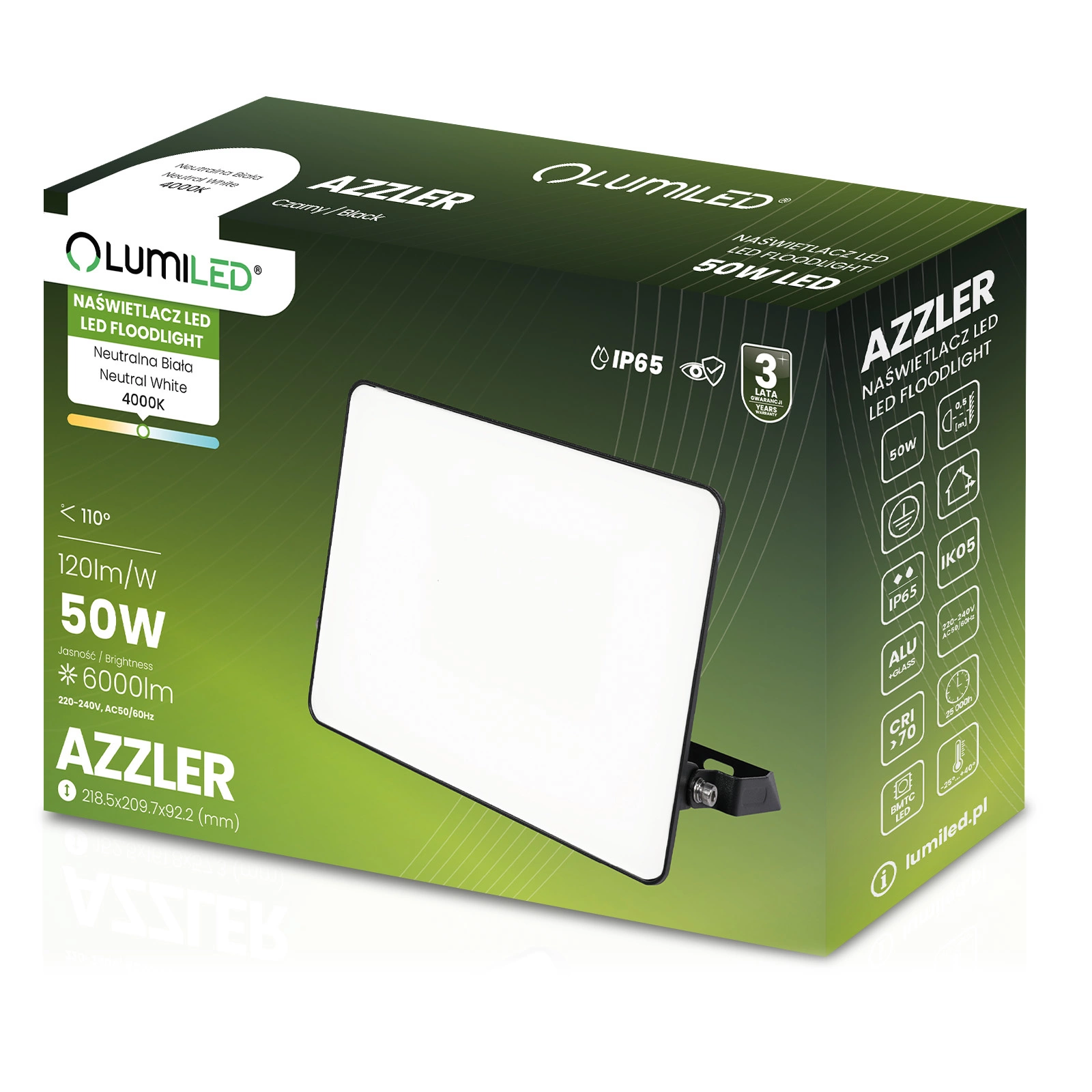 LED reflektor Lumiled AZZLER je moderní a energeticky úsporné řešení osvětlení, které vyniká vysokou světelnou účinností, robustní konstrukcí a minimalistickým estetickým designem. Díky použití špičkové technologie LED generuje zařízení světelný tok 6000 lm, což umožňuje efektivně osvětlit i velké prostory při zachování nízké spotřeby energie.