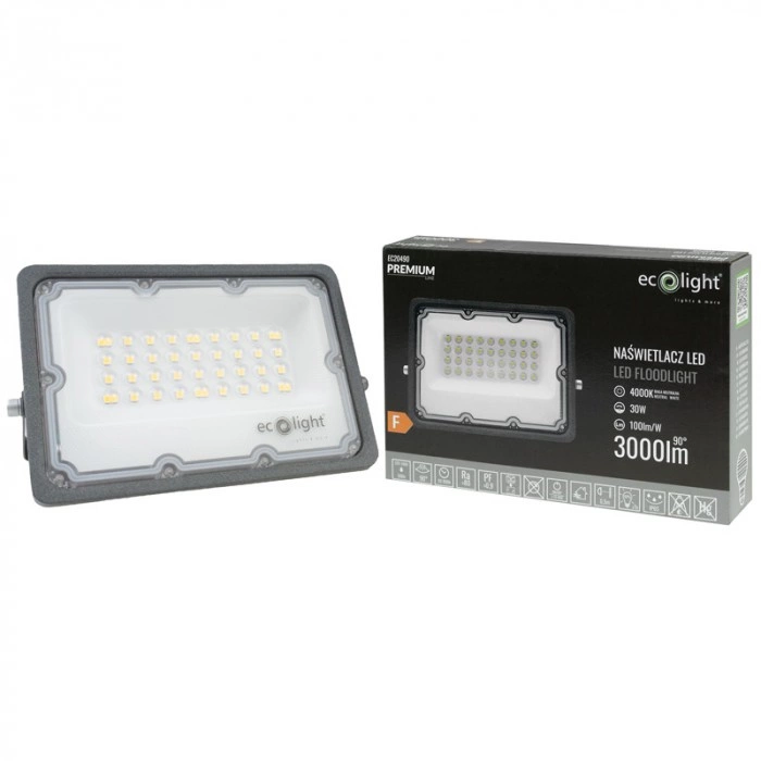 Objevte kvalitu a spolehlivost LED reflektorů Ecolight řady Premium Line, speciálně navržených pro náročné uživatele. Tento špičkový 30W LED reflektor generuje působivý světelný tok 3 000 lumenů a poskytuje vynikající osvětlení za všech podmínek. Díky integrovaným LED diodám SMD nabízí výrobek výjimečnou světelnou účinnost 100 lm/W. Promyšlená konstrukce s úhlem rozložení světla 90° umožňuje přesné nasměrování osvětlení na požadovaná místa, takže je ideální pro venkovní použití, a to i díky stupni krytí IP65.