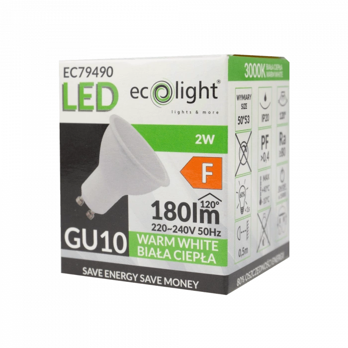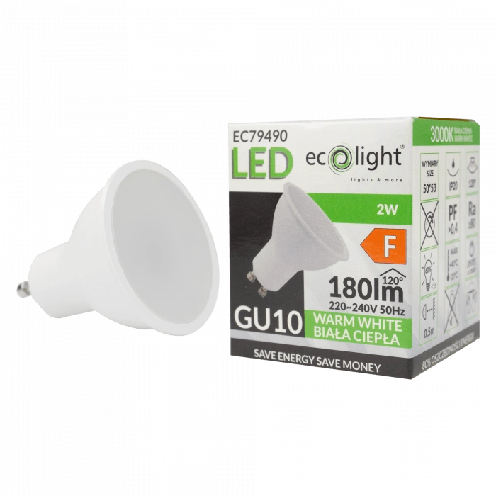 Výrobek je vybaven paticí GU10 a jmenovitým napětím 220-240 V, což zajišťuje jeho kompatibilitu s většinou svítidel na trhu. Je vyrobeno z odolného plastu v mléčném odstínu, poskytuje vynikající ochranu proti poškození a životnost až 20 000 hodin. Rozhodněte se pro kvalitu a udržitelnost s moderní žárovkou Ecolight.