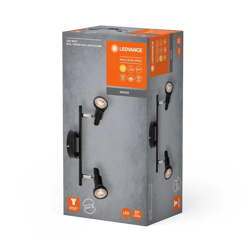 Estetické svítidlo v černé barvě je vyrobeno z vysoce kvalitní oceli, která zajišťuje odolnost a stylový vzhled. Díky stupni krytí IP20 je svítidlo vhodné pro použití v interiéru. Díky povrchové montáži a možnosti výměny světelného zdroje je instalace uživatelsky přívětivá a snadná. Napájení ze sítě 220-240 V a vysoký index podání barev Ra90 zajišťují věrnou reprodukci barev.