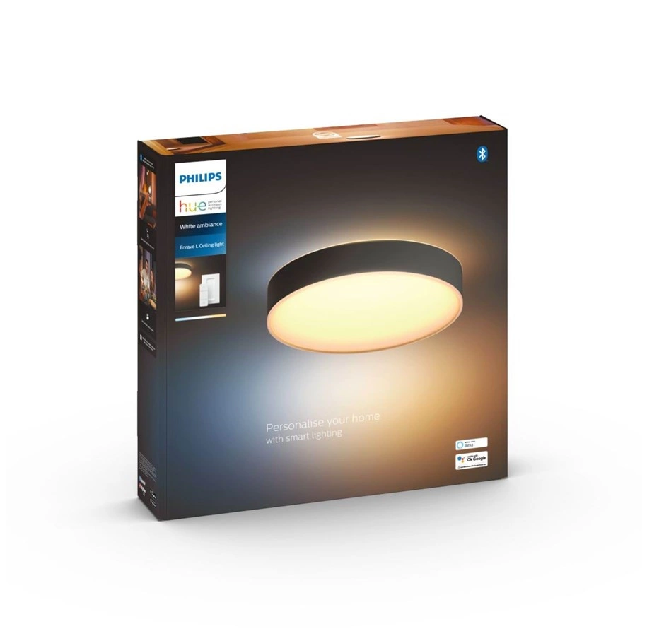 Stropní světlo HUE ENRAVE LED plafond uznávaný a respektovaný v oboru osvětlení Philips. Svítidlo vybavené integrovaným světelným zdrojem LED 33,5W a velmi účinný světelný výkon - 4300 lm, vyzařuje příjemné a relaxační světlo z nastavitelná teplota barev od příjemně teplé přes neutrální až po studenou, s nimiž můžeme vytvořit náladu vhodnou pro každou příležitost. Stropní svítidlo ENRAVE nejenže díky svému stylovému krytu dokonale ladí s interiérem domácnosti, ale také nabízí možnost vyzařování světla směrem dolů i nahoru, což zaručuje funkční osvětlení. Tato lampa může fungovat samostatně nebo jako součást systému chytrého osvětlení po připojení k můstku Hue. Snadné zapínání a vypínání světel, stmívání, rozjasňování a výběr z různých světelných scén.