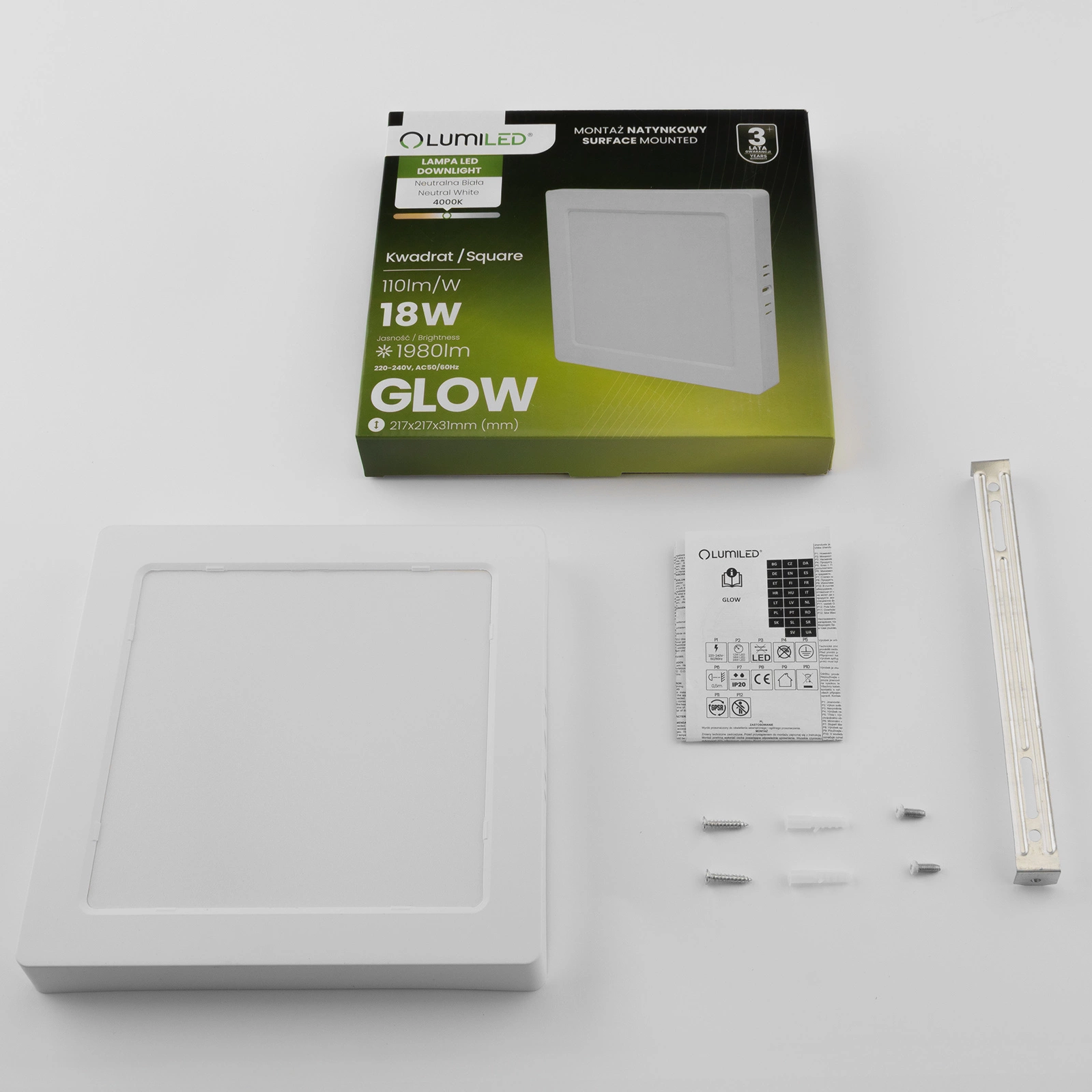 18W LED svítidlo pro povrchovou montáž z řady GLOW od společnosti Lumiled je ideální kombinací pohodlí, estetiky a úspornosti. Neutrální 4000K světlo poskytuje pohodlí při práci i v každodenním životě a účinnost 110 lm/W umožňuje jasné osvětlení s nízkou spotřebou energie. Kompaktní tvar se hodí do každého interiéru a snadná povrchová montáž eliminuje nutnost úprav. Jedná se o spolehlivé řešení, které vydrží dlouhá léta - bezúdržbové.