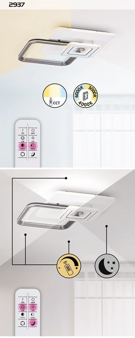 Stropní LED svítidlo nabízí řadu pokročilých funkcí, které zajišťují nejen úsporu energie, ale také vysokou úroveň komfortu. Je vybaveno dálkovým ovládáním prostřednictvím dálkového ovladače, který umožňuje nastavit jas díky funkci stmívání a měnit barevnou teplotu světla (CCT) podle vašich potřeb, což z něj činí mimořádně všestranný a funkční doplněk. Navíc je vybaven praktickým časovačem, který umožňuje automatické vypnutí, což výrazně zvyšuje energetickou účinnost a prodlužuje životnost systému, která je až 20 000 hodin.