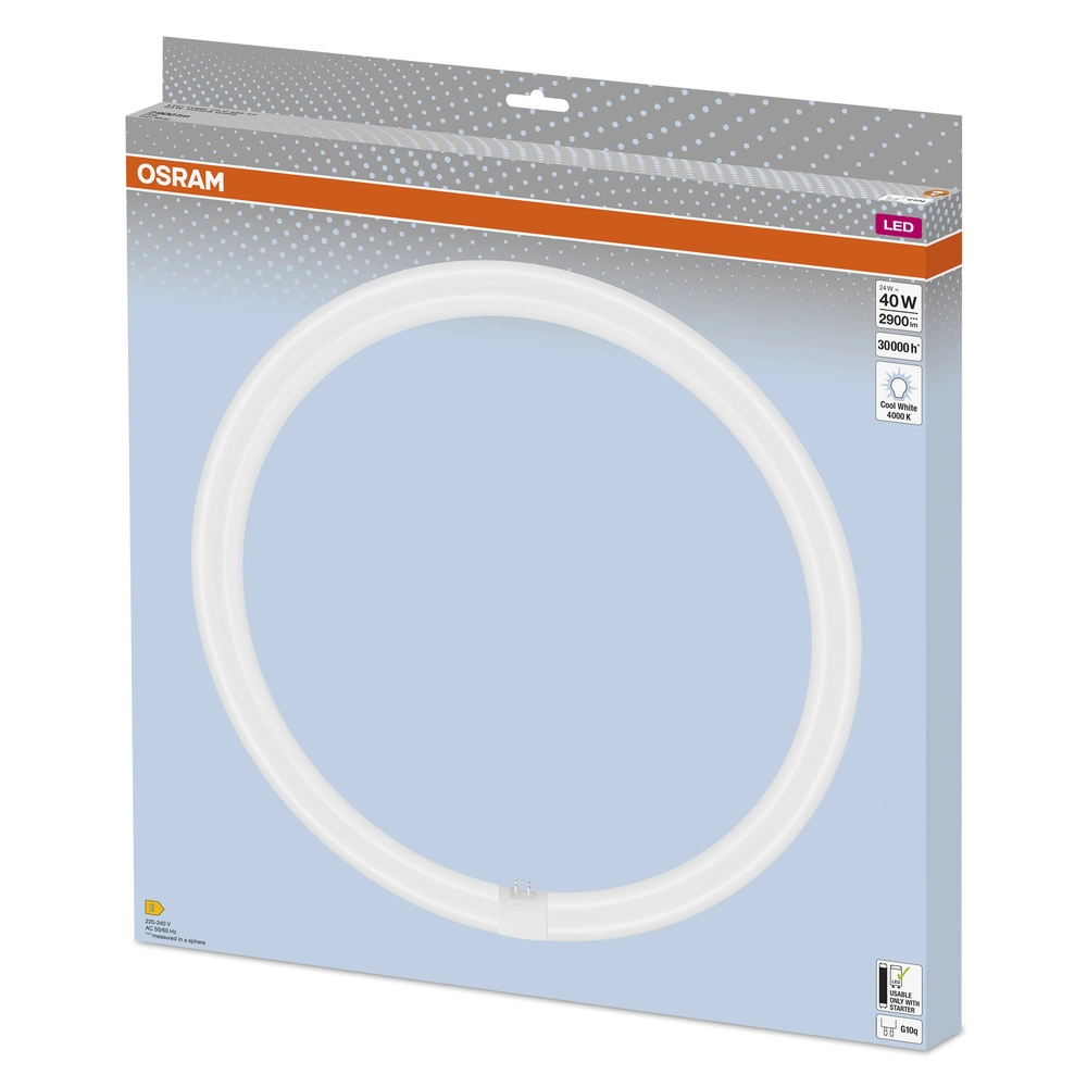 24W LED zářivka T9 Circular G10q od společnosti Osram je moderní světelný zdroj, který je ideální náhradou za tradiční 40W žárovky. Se světelným tokem 2900 lm je ideální pro prostory vyžadující jasné a rovnoměrné osvětlení, jako jsou kanceláře, kuchyně a obývací pokoje. S barvou světla 4000 K nabízí neutrální bílé světlo ideální pro každodenní použití.