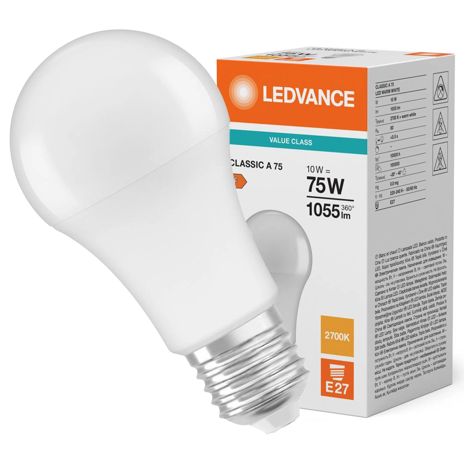 LED žárovka LEDVANCE A60 E27 10W je moderní řešení, které kombinuje úsporu energie a dlouhou životnost, ideální pro osvětlení domácností a kanceláří. S výkonem 10 wattů a ekvivalentem 75 wattů klasické žárovky poskytuje optimální rovnováhu mezi účinností a provozními náklady. Světelný tok 1055 lumenů a barevná teplota 2700 K zaručují příjemné, teplé bílé světlo, které podporuje relaxaci a vytváří příjemnou atmosféru.