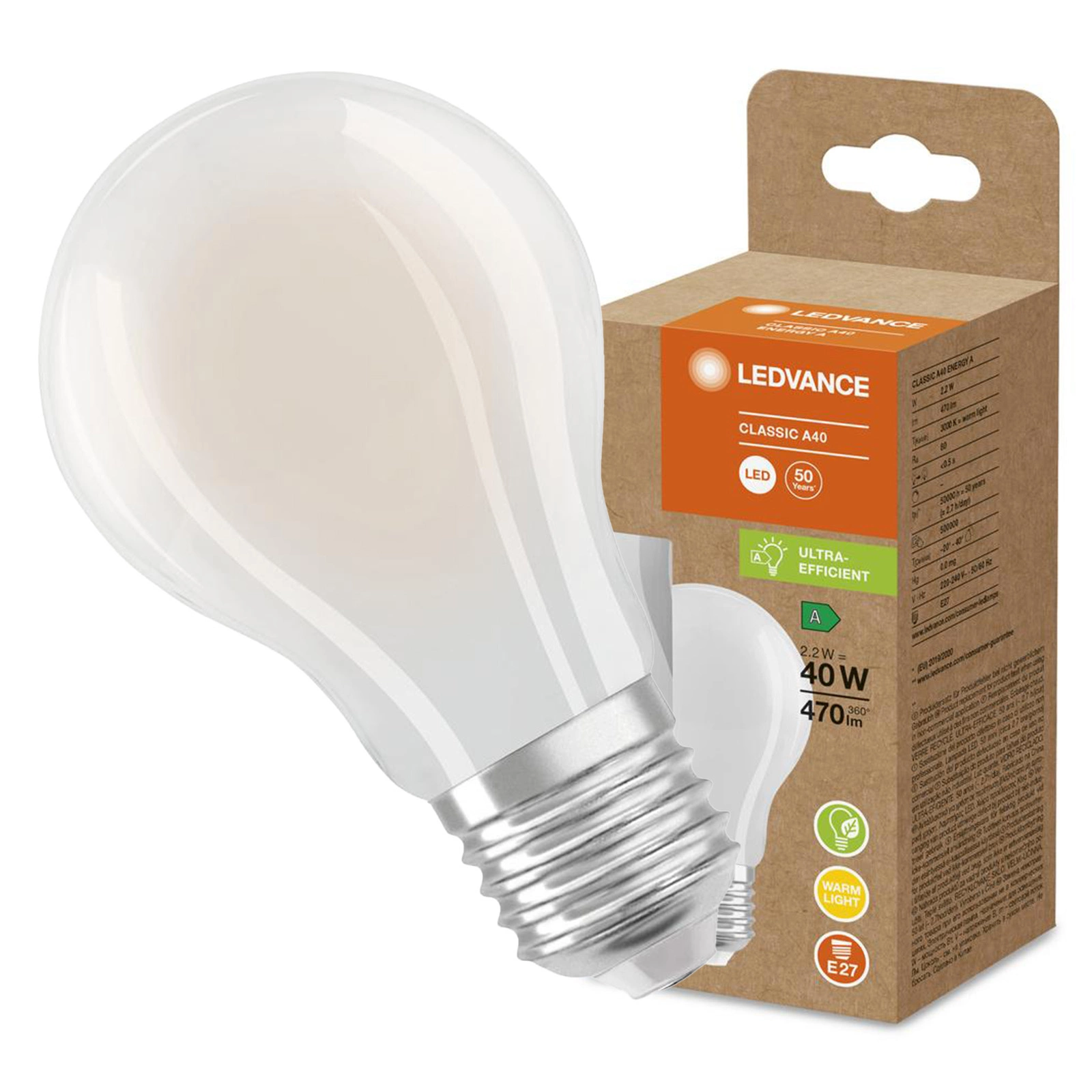 Žárovka LEDVANCE A60 E27 2,2W LED žárovka s vláknem kombinuje moderní technologie s tradičním vzhledem. Vyzařuje 470 lumenů teplé bílé světlo s barevnou teplotou 3000K, vytvoření útulné atmosféry v každé místnosti. Je energeticky účinný, spotřebovává pouze 2.2W, a životnost až 50 000 hodin, s až 500 000 spínacích cyklů. Má třídu energetické účinnosti A, neobsahuje rtuť a nabízí vysokou odolnost a spolehlivost.
