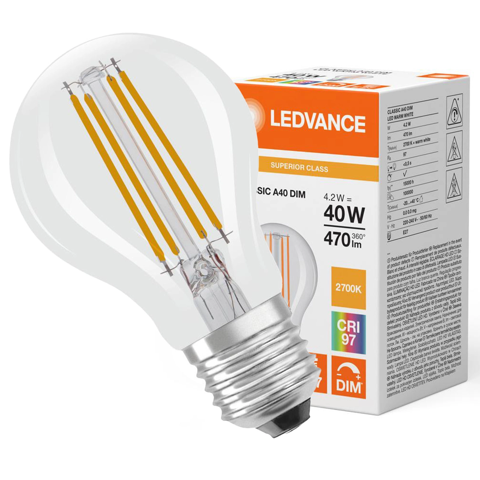 Má vynikající index podání barev Ra na adrese 97, která zaručuje přesnou reprodukci barev okolí. Díky tomu je ideální pro domácí i komerční použití, kde je kvalita světla stejně důležitá jako jeho estetika. Žárovka je plně stmívatelná, která umožňuje nastavit intenzitu osvětlení podle vašich potřeb a nálad. Vysoká životnost až 15 000 hodin a odolnost vůči častému přepínání, což potvrzuje i 100 000 cyklů, je spolehlivou volbou na mnoho let. Je vyroben z čirého skla a bude vypadat krásně v klasickém i moderním prostředí.