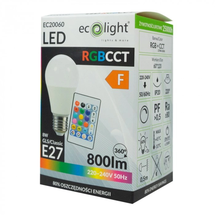 Objevte ve svém domově jedinečnou atmosféru s 8W LED žárovkou A60 E27 od společnosti Ecolight. Tato vícebarevná žárovka s možností stmívání a funkcí změny barev RGB vám poskytne plnou kontrolu nad osvětlením vašeho prostoru. Pomocí přiloženého dálkového ovládání můžete snadno nastavit intenzitu a barvu světla a vytvořit tak náladu ideální pro každou příležitost. Díky životnosti až 20 000 hodin a účinnosti až 100 lm/W se jedná o výrobek, který v sobě spojuje inovaci a úsporu energie.