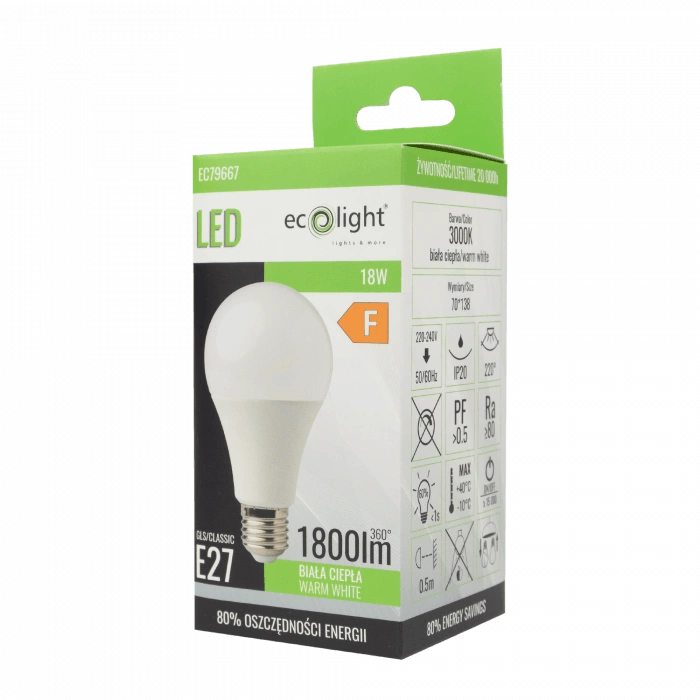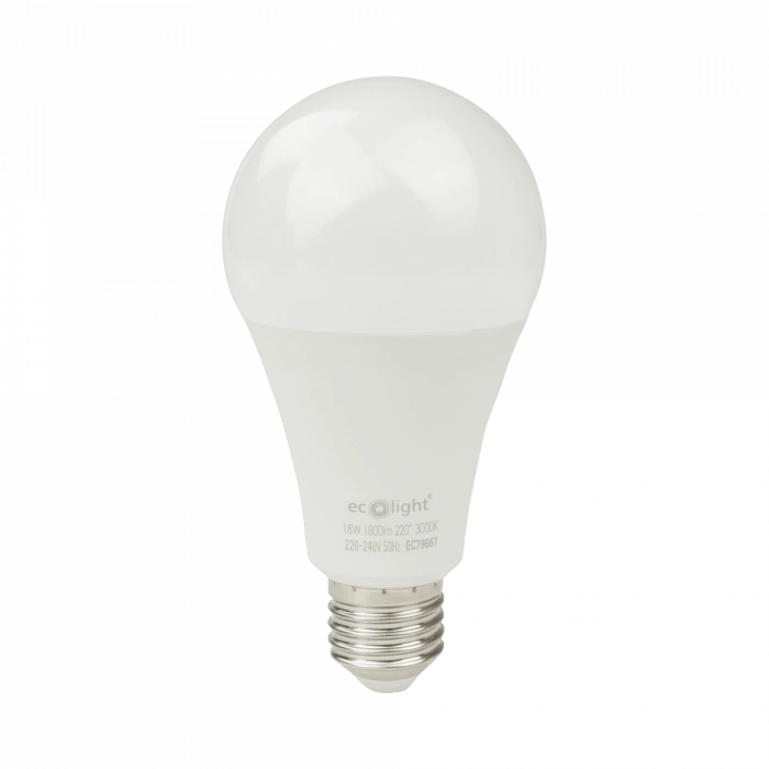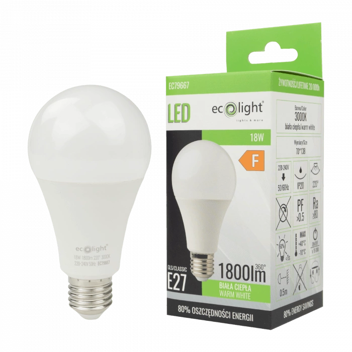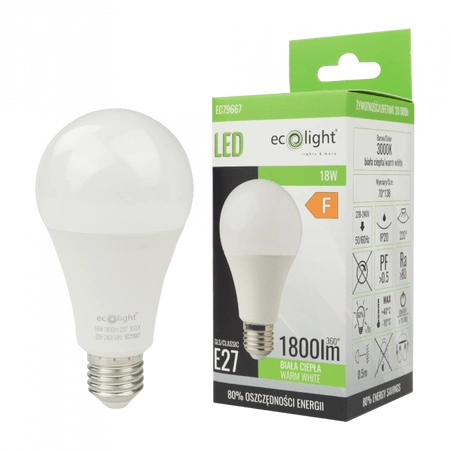 Rozsviťte svůj domov hřejivou a příjemnou atmosférou s 18W LED žárovkou A70 E27 od společnosti Ecolight! Tato moderní žárovka nabízí světelný tok 1620 lm, což vám umožní efektivně a úsporně osvětlit jakoukoli místnost. Díky barvě světla 3000 K získá interiér vašeho domova útulnou atmosféru, která je ideální pro relaxaci a odpočinek. Díky patici typu E27 a tvaru tradiční žárovky se snadno instaluje a je kompatibilní s většinou svítidel.