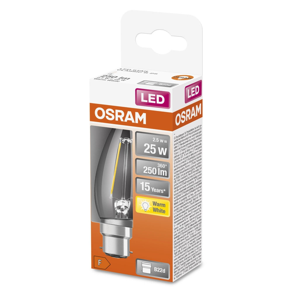 LED žárovka B35 svíčka B22d 2,5W = 25W 250lm 2700K teplá bílá 300° Retrofit Filament CLASSIC Osram