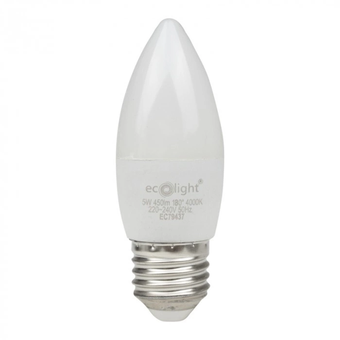 Rozsviťte svůj domov krásným a energeticky úsporným světlem s 5W LED žárovkou Ecolight. Moderní žárovka ve tvaru svíčky (B37) s paticí E27 poskytuje jas 450 lm se světelnou účinností 90 lm/W. Světlo v neutrálním odstínu 4000 K se skvěle hodí do obývacích pokojů, ložnic nebo kuchyní a zajistí příjemnou a pohodlnou atmosféru. Ideální pro ty, kteří ocení nadčasový design a funkčnost.