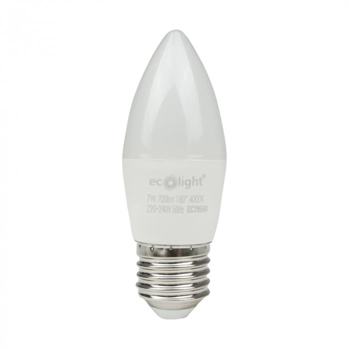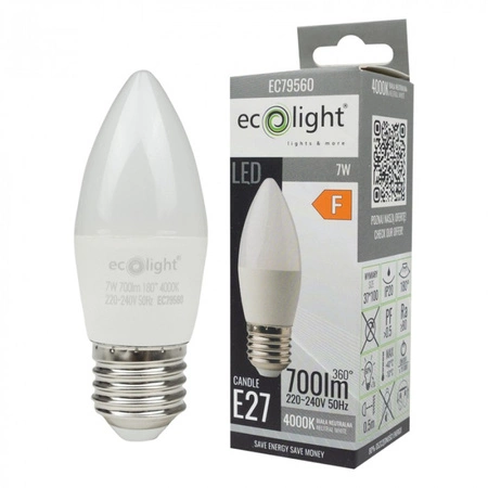 Objevte dokonalý zdroj světla pro svůj domov s LED žárovkou Ecolight B37 E27 s příkonem 7 W a světelným tokem 630 lm. Tato žárovka s vysokou světelnou účinností 90lm/W září jasným, neutrálním bílým světlem o teplotě 4000K. Je ideální pro místnosti, kde je vyžadována přirozená reprodukce barev, a poskytuje index podání barev Ra80. Tvar svíčky a mléčná clona jí dodávají elegantní vzhled, takže je nejen funkčním, ale i stylovým doplňkem každého interiéru.