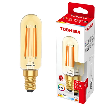 Žárovka LED FILAMENT společnosti Toshiba s uzávěrem E14 a sílu 4,5W je vysoce kvalitní světelný zdroj LED. Tato žárovka byla vyrobena s využitím moderních řešení založených na inovativní technologii LED, která se vyznačují tím, že vysokou účinností světelných parametrů, věrnou reprodukcí barev osvětlovaných předmětů a mimořádně dlouhou životností. Hlavní výhodou LED žárovek je nižší spotřeba elektrické energie ve srovnání se standardními světelnými zdroji. V podobě tradiční žárovky s průhledným žlutým stínítkem. Žárovku lze instalovat do všech běžných svítidel se závitem E14. Výměna světelného zdroje je jednoduchá a nezpůsobuje žádné problémy. Stačí vyměnit staré žárovky za nové a je hotovo.