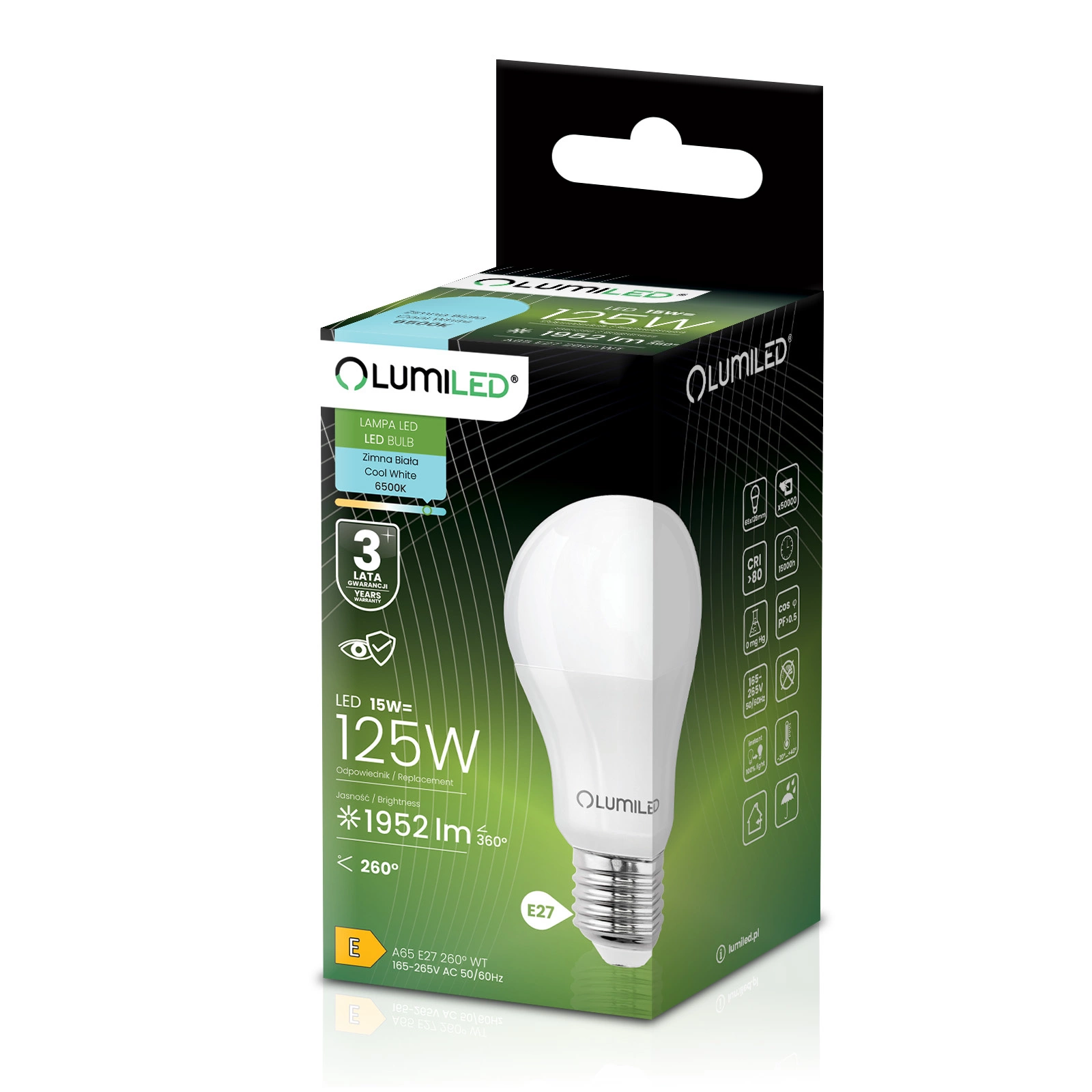 LED žárovka renomované značky LUMILED s paticí E27 a příkonem 15 W je vynikající náhradou za tradiční 25W žárovky a nabízí úsporu energie a delší životnost. Vyzařuje světlo se světelným tokem 1 952 lumenů a studenou barvou 6500 K, takže je ideální pro osvětlení interiérů, kde je vyžadována výrazná bílá barva světla. Vyzařovací úhel 260° umožňuje široký rozptyl světla a účinně osvětluje místnost. Díky kvalitní konstrukci má životnost až 15 000 hodin, což znamená mnoho let používání. Kromě toho pracuje v širokém rozsahu napětí 165-265 V a je vhodný pro použití při okolních teplotách od -20 °C do +40 °C. Ideální volba pro ty, kteří si cení úspory energie a péče o životní prostředí.
