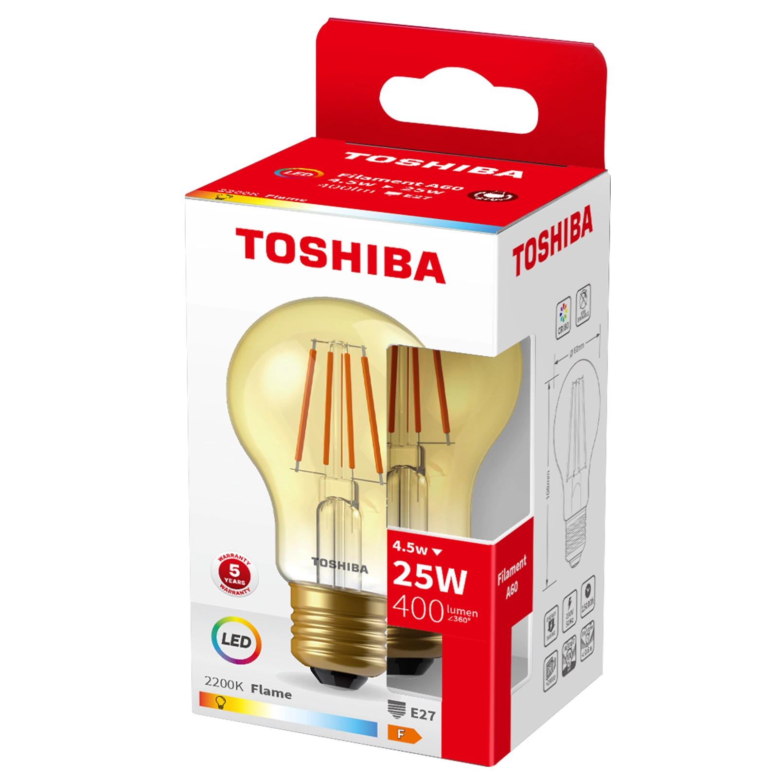 Žárovka LED FILAMENT společnosti Toshiba s uzávěrem E27 a sílu 4,5W je vysoce kvalitní světelný zdroj LED. Tato žárovka byla vyrobena s využitím moderních řešení založených na inovativní technologii LED, která se vyznačují tím, že vysokou účinností světelných parametrů, věrnou reprodukcí barev osvětlovaných předmětů a mimořádně dlouhou životností. Hlavní výhodou LED žárovek je nižší spotřeba elektrické energie ve srovnání se standardními světelnými zdroji. V podobě tradiční žárovky s průhledným difuzérem. Žárovku lze instalovat do všech běžných svítidel se závitem E27. Výměna světelného zdroje je jednoduchá a nezpůsobuje žádné problémy. Stačí vyměnit staré žárovky za nové a je hotovo.