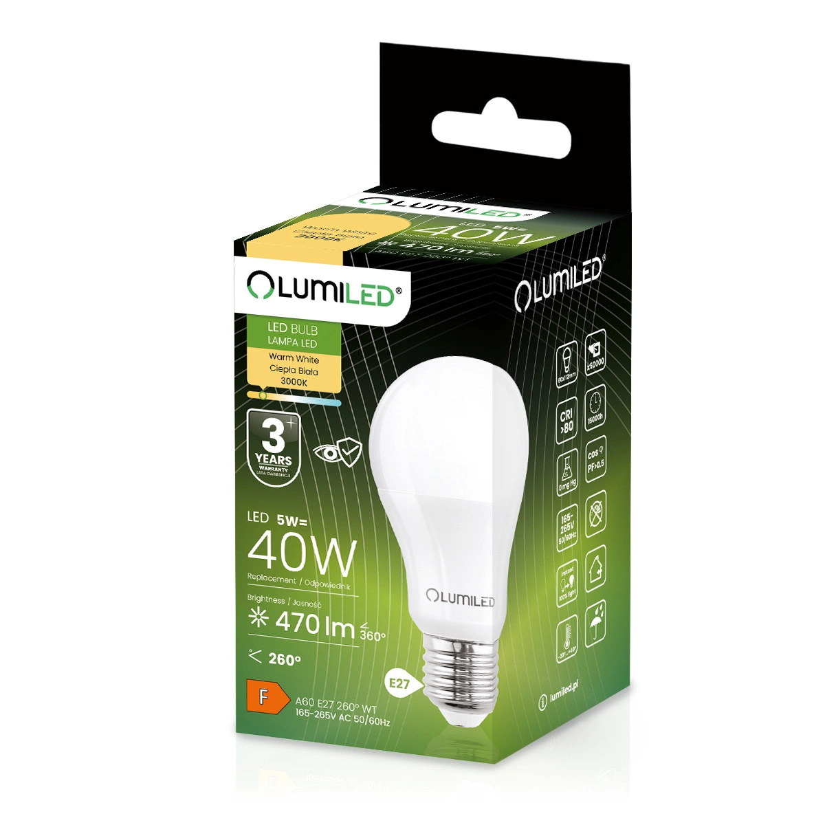 LED žárovka renomované značky LUMILED s paticí E27 a příkonem 5 W je vynikající náhradou za tradiční 40W žárovky a nabízí úsporu energie a delší životnost. Vyzařuje světlo se světelným tokem 470 lumenů a teplou barvou 3000 K, takže je ideální pro osvětlení interiérů, kde je vyžadována měkká a příjemná barva světla. Úhel svícení 260° umožňuje široký rozptyl světla a účinně osvětluje místnost. Díky kvalitnímu zpracování má životnost až 15 000 hodin, což znamená mnoho let používání. Kromě toho pracuje v širokém rozsahu napětí 165-265 V a je vhodný pro použití při okolních teplotách od -20 °C do +40 °C. Ideální volba pro ty, kteří si cení úspory energie a péče o životní prostředí.