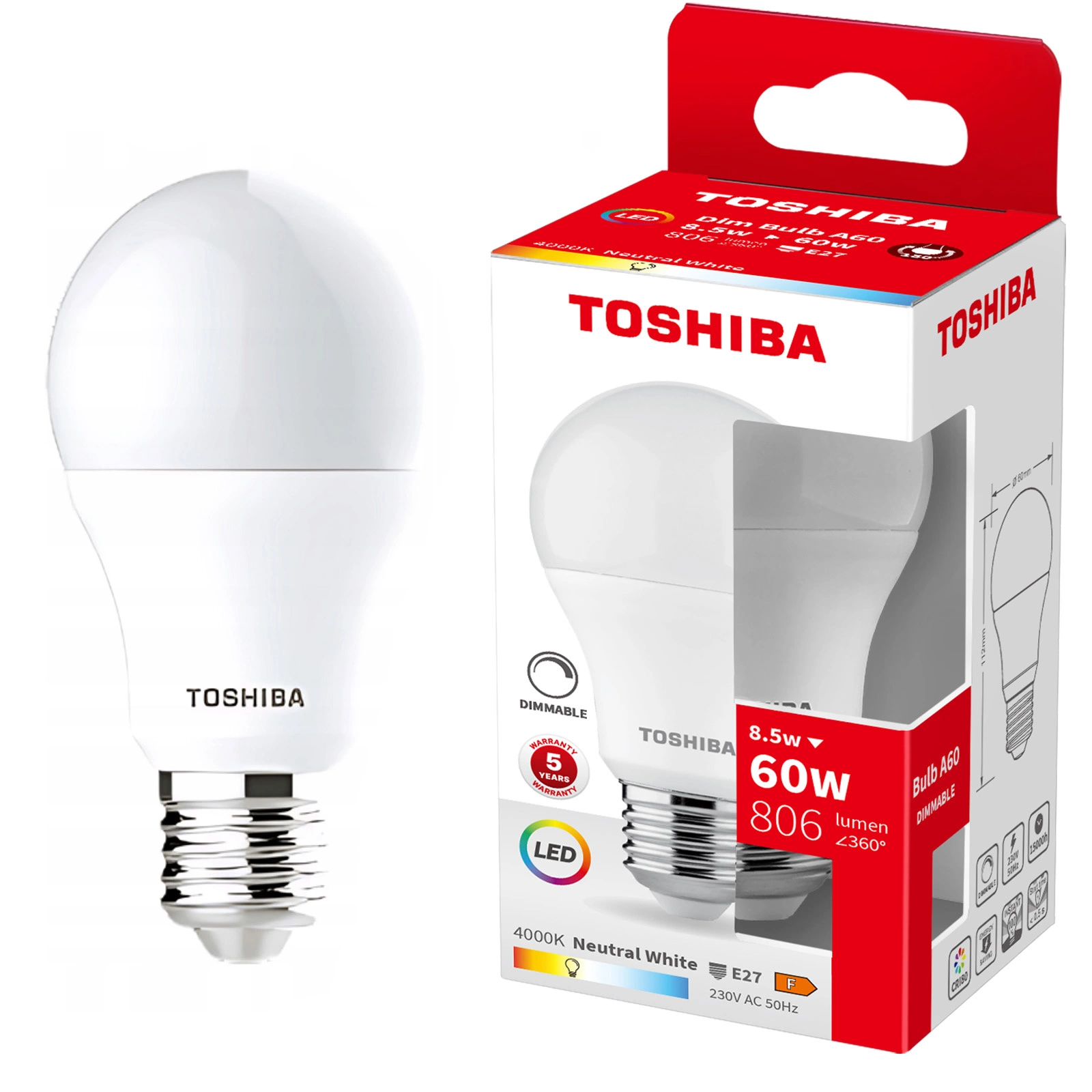 LED žárovka společnosti Toshiba s uzávěrem E27 a sílu 8,5W je vysoce kvalitní světelný zdroj LED. Tato žárovka byla vyrobena s využitím moderních řešení založených na inovativní technologii LED, která se vyznačují tím, že vysokou účinností světelných parametrů, věrnou reprodukcí barev osvětlovaných předmětů a mimořádně dlouhou životností. Hlavní výhodou LED žárovek je nižší spotřeba elektrické energie ve srovnání se standardními světelnými zdroji. V podobě tradiční žárovky s mléčným difuzérem, který snižuje oslnění. Žárovku lze instalovat do všech běžných svítidel se závitem E27. Výměna světelného zdroje je jednoduchá a nezpůsobuje žádné problémy. Stačí vyměnit staré žárovky za nové a je hotovo.