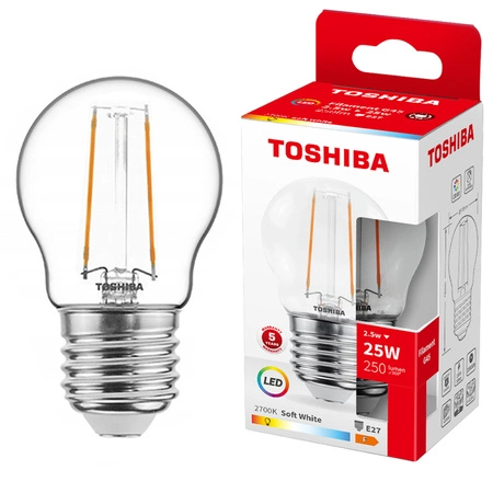 Žárovka LED FILAMENT společnosti Toshiba s uzávěrem E27 a sílu 2,5W je vysoce kvalitní světelný zdroj LED. Tato žárovka byla vyrobena s využitím moderních řešení založených na inovativní technologii LED, která se vyznačují tím, že vysokou účinností světelných parametrů, věrnou reprodukcí barev osvětlovaných předmětů a mimořádně dlouhou životností. Hlavní výhodou LED žárovek je nižší spotřeba elektrické energie ve srovnání se standardními světelnými zdroji. V podobě tradiční žárovky s průhledným difuzérem. Žárovku lze instalovat do všech běžných svítidel se závitem E27. Výměna světelného zdroje je jednoduchá a nezpůsobuje žádné problémy. Stačí vyměnit staré žárovky za nové a je hotovo.