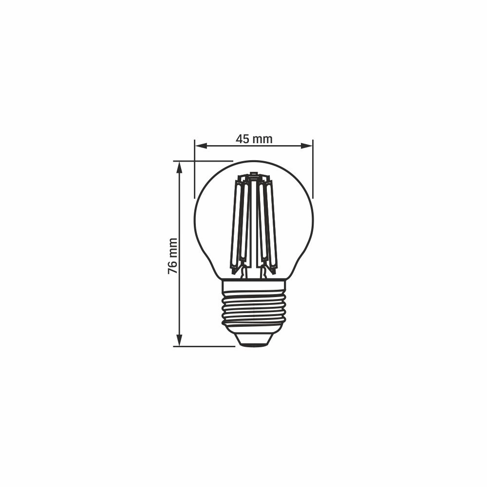 6W kulová žárovka LED E27 G45, která odpovídá tradiční 60W žárovce, poskytuje vynikající osvětlení se světelným tokem 806 lm. Vyzařuje teplé, příjemné světlo s barevnou teplotou 3000 K, takže je ideální pro obytné i komerční prostory. Použití technologie FILAMENT zaručuje široký 360° rozptyl světla a vytváří tak příjemnou a harmonickou atmosféru.