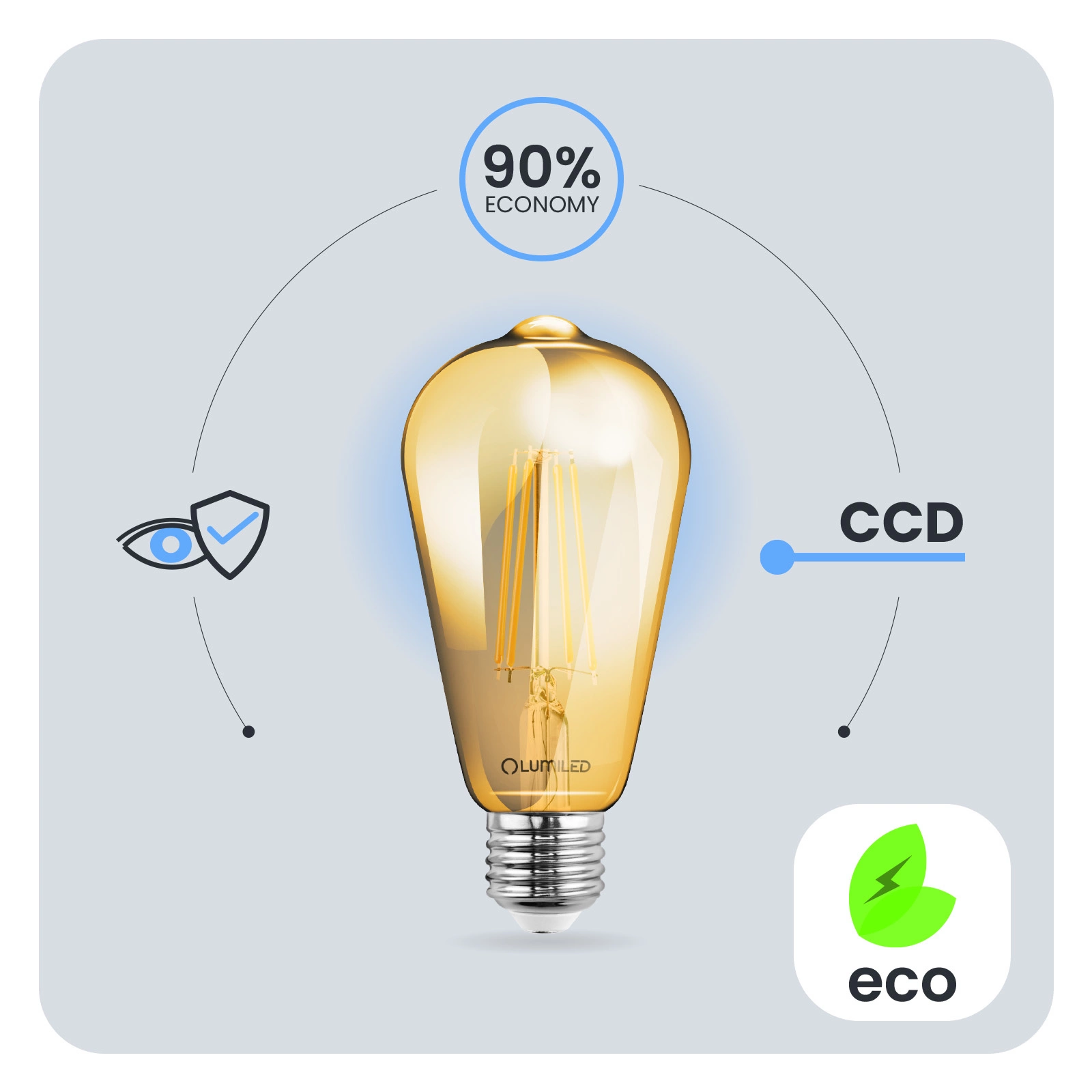 Díky měniči CCD použitému v žárovce LED je žárovka odolná vůči poklesům a špičkám síťového napětí. Světlo nebliká ani se netřese. Díky měniči CCD je žárovka dlouhodobě bezporuchová. Žárovky LUMILED jsou navrženy s ohledem na uživatele. Špatná kvalita osvětlení může vést k únavě očí, proto mají naše žárovky technický vývoj Eye Safe, který zajišťuje pohodlné a šetrné osvětlení pro vaše oči v jakékoli místnosti.
