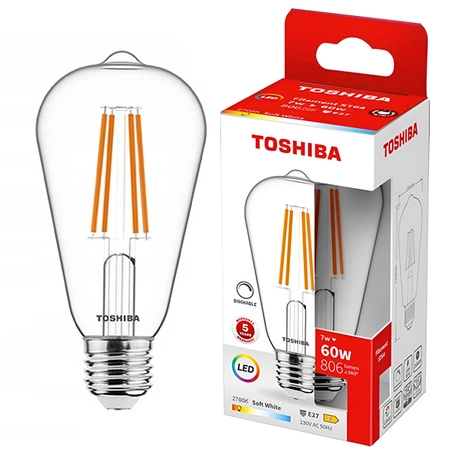 Žárovka LED FILAMENT společnosti Toshiba s uzávěrem E27 a sílu 7W je vysoce kvalitní světelný zdroj LED. Tato žárovka byla vyrobena s využitím moderních řešení založených na inovativní technologii LED, která se vyznačují tím, že vysokou účinností světelných parametrů, věrnou reprodukcí barev osvětlovaných předmětů a mimořádně dlouhou životností. Hlavní výhodou LED žárovek je nižší spotřeba elektrické energie ve srovnání se standardními světelnými zdroji. V podobě tradiční žárovky s průhledným žlutým stínítkem. Žárovku lze instalovat do všech běžných svítidel se závitem E27. Výměna světelného zdroje je jednoduchá a nezpůsobuje žádné problémy. Stačí vyměnit staré žárovky za nové a je hotovo.