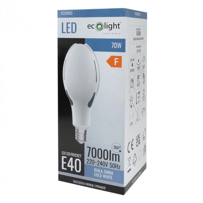 Představujeme revoluční LED žárovku E40 Rocket Ecolight, která změní vaše osvětlení. S příkonem 70 W a působivým světelným tokem 7000 lm zajistí vynikající jas v každé místnosti. Je ideální pro osvětlení velkých prostor a díky studené barvě světla 6000 K vytváří příjemnou atmosféru připomínající přirozené denní světlo.