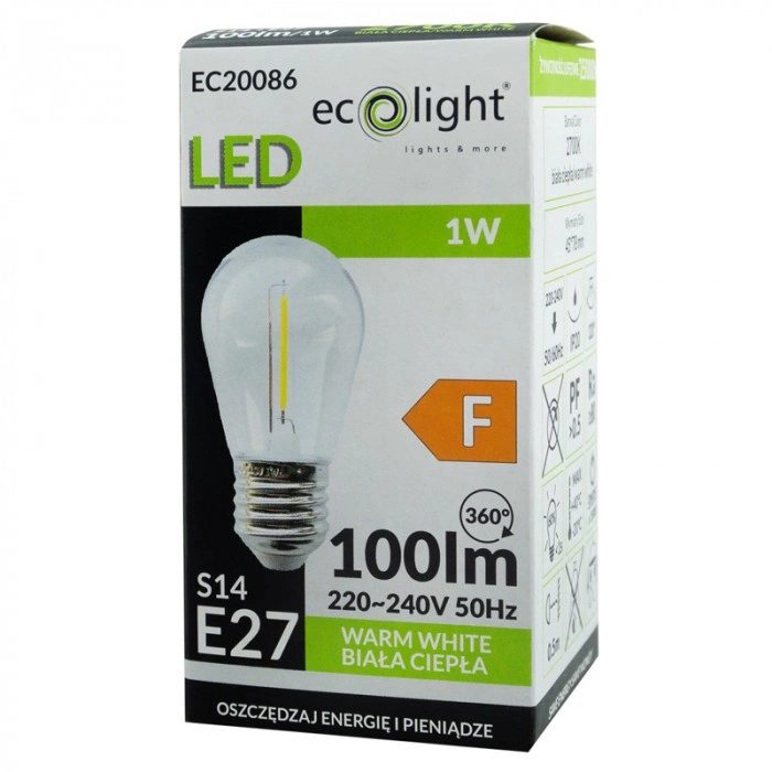 LED žárovka Edison S14 E27 1W 100lm 2700K Warm FILAMENT Ecolight je dokonalou kombinací klasického stylu a modernosti! Díky jedinečnému designu připomínajícímu tradiční uhlíkové žárovky a pokročilé technologii LED poskytuje nejen elegantní vzhled, ale také šetří energii. Žárovka vyzařuje teplou bílou barvu s teplotou 2700 K, která vytvoří útulnou atmosféru ve vaší domácnosti, kanceláři nebo restauraci.