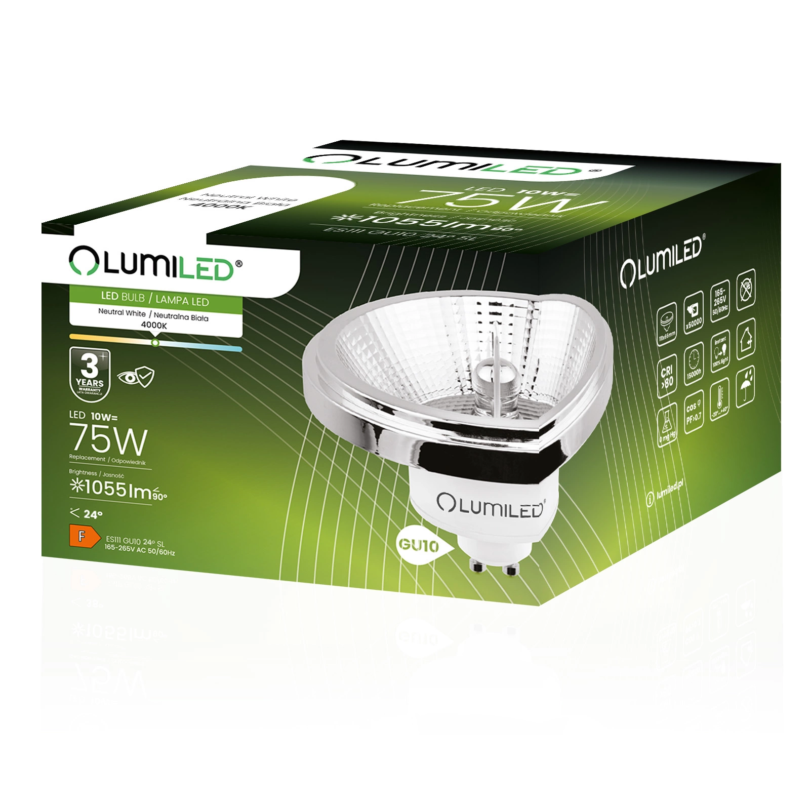 LED žárovka renomované značky LUMILED s paticí GU10 a výkonem 10 W je vynikající náhradou za tradiční 75W žárovky, která nabízí úsporu energie a delší životnost. Vyzařuje světlo se světelným tokem 1055 lumenů a neutrální barvou 4000 K, takže je ideální pro osvětlení interiérů, kde je požadována jasná a přirozená barva světla. Úhel svícení 24° umožňuje úzké šíření světla, které účinně zvýrazňuje osvětlované objekty. Díky kvalitnímu zpracování má životnost až 15 000 hodin, což znamená mnoho let používání. Kromě toho pracuje v širokém rozsahu napětí 165-265 V a je vhodný pro použití při okolních teplotách od -20 °C do +40 °C. Ideální volba pro ty, kteří si cení úspory energie a péče o životní prostředí.