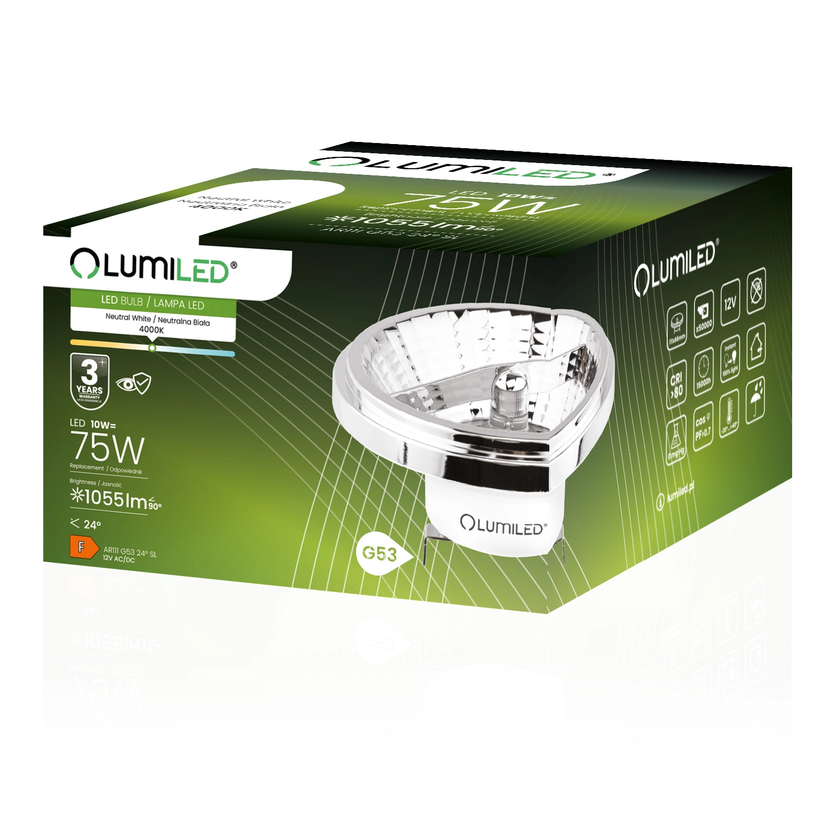 LED žárovka renomované značky LUMILED s paticí G53 a příkonem 10 W je vynikající náhradou za tradiční 75W žárovky, která nabízí úsporu energie a delší životnost. Vyzařuje světlo se světelným tokem 1055 lumenů a neutrální barvou 4000 K, takže je ideální pro osvětlení interiérů, kde je požadována jasná a přirozená barva světla. Úhel svícení 24° umožňuje úzké šíření světla, které účinně zvýrazňuje osvětlované předměty. Díky vysoce kvalitní konstrukci má životnost až 15 000 hodin, což znamená mnoho let používání. Žárovka je navíc napájena stejnosměrným napětím 12 V, takže je bezpečná pro domácí použití, a je vhodná pro použití při okolních teplotách od -20 °C do +40 °C. Ideální volba pro ty, kteří si cení úspory energie a péče o životní prostředí.