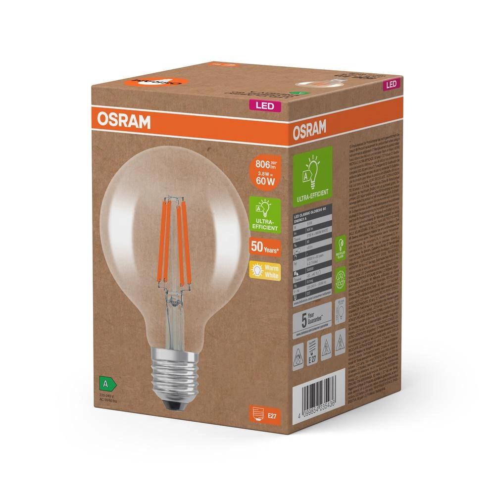 LED žárovka G95 Sphere E27 3,8W = 60W 806lm 2700K Warm 300° Filament CLASSIC ENERGETICKÁ ÚSPORNOST Osram