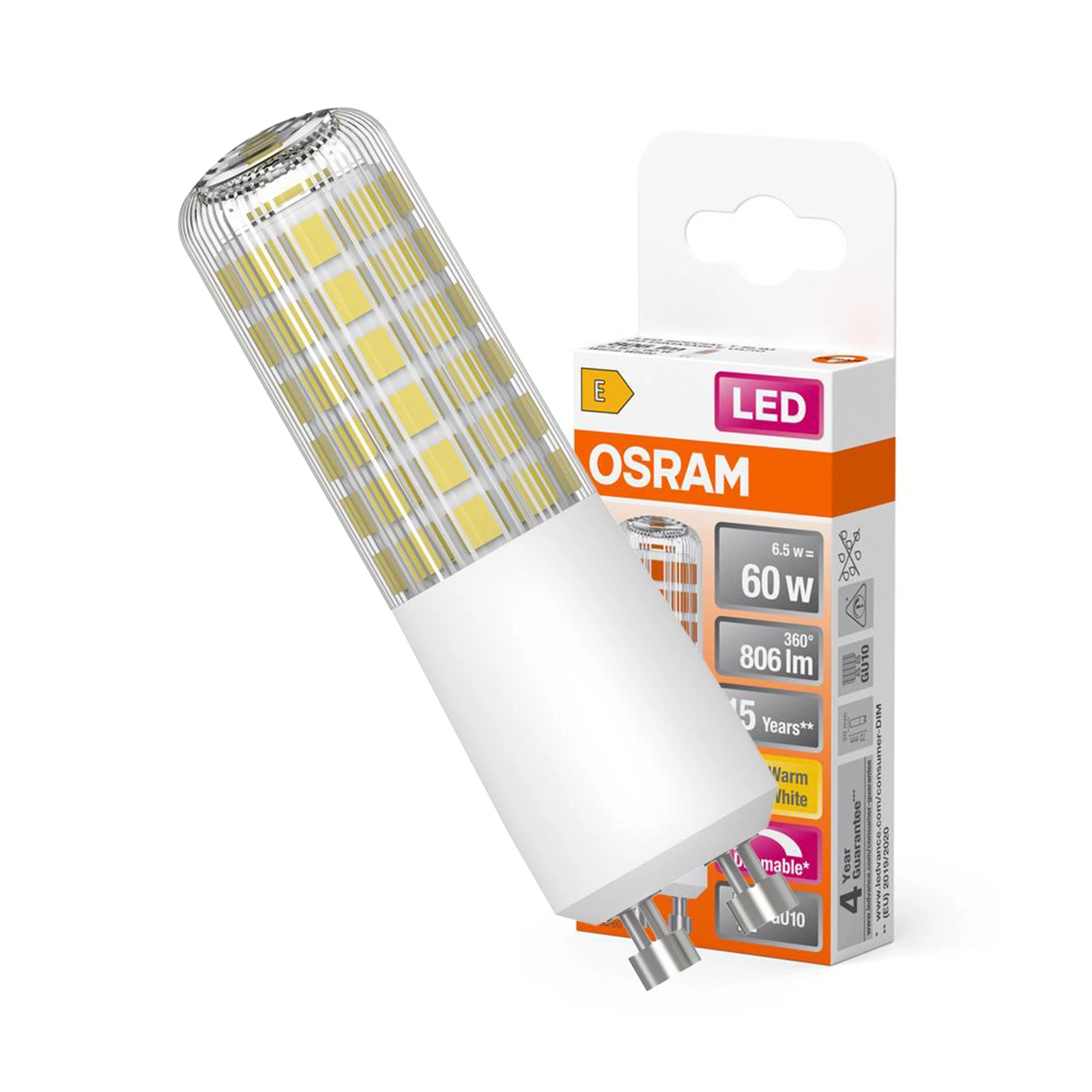OSRAM LED T Slim 60 320° DIM 6,5W 827 Clear GU10 je moderní LED žárovka s 6.5 W, která je vynikající náhradou za tradiční 50W halogenové žárovky. Vyzařuje teplou barvu světla 2700 K a světelný tok 350 lm. Má vysoký index podání barev Ra ≥ 80, pro přirozenou reprodukci barev. Díky svítivost 115 lm/W i funkce stmívání, umožňuje nastavení intenzity světla. Spotřebuje až o 90 % méně energie než tradiční žárovky. Ideální pro všeobecné a dekorativní osvětlení, snadná instalace díky rukojeti GU10.