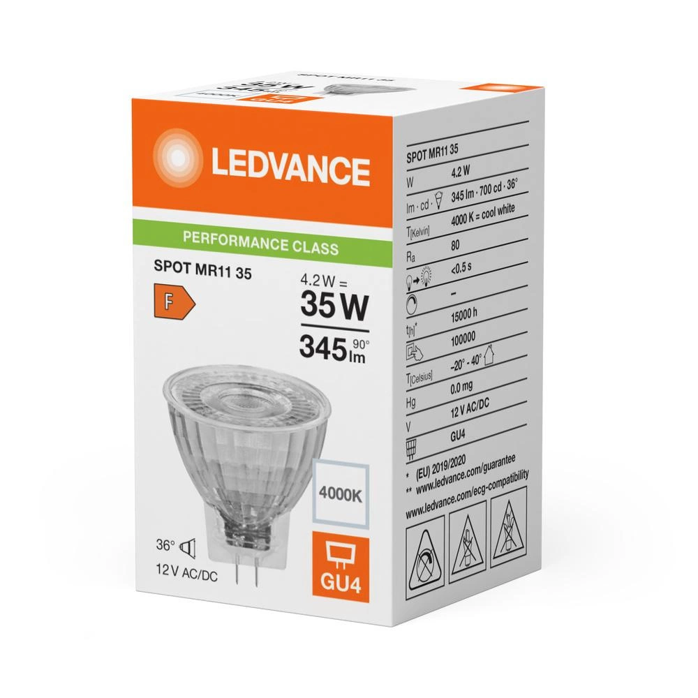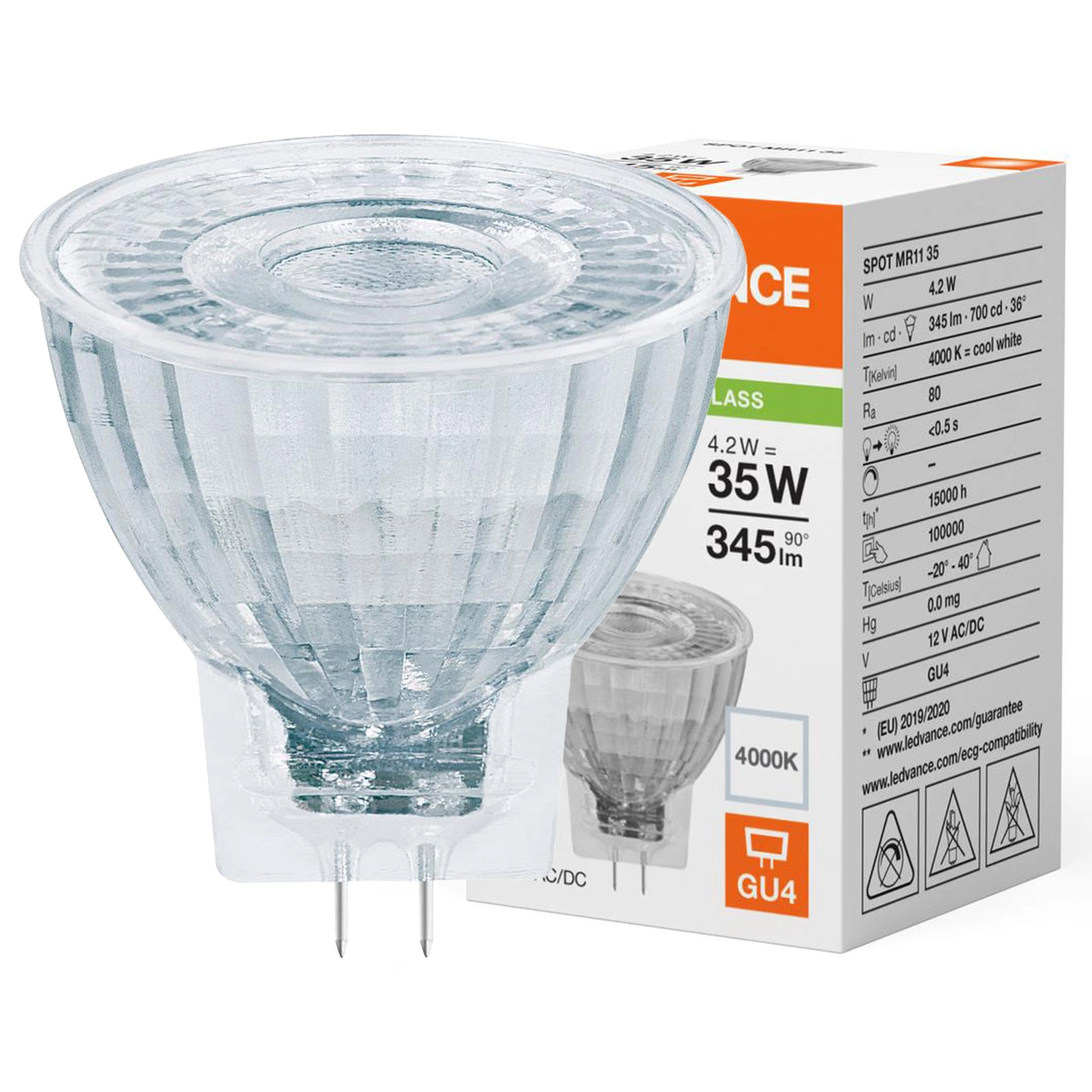 Představení moderního lED žárovka MR11 GU4 4,2W značky LEDVANCE, která je moderní alternativou tradičních žárovek s příkonem 35W. Díky technologii Filament LED nabízí produkt jasný světelný tok o hodnotě 345 lm s neutrální bílou barvou světla 4000K. Tato energeticky úsporná žárovka, která funguje na přívodu 12V, poskytuje vynikající životnost až 15 000 hodin, což výrazně snižuje četnost výměny světelného zdroje.