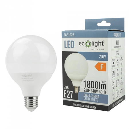 Objevte jedinečný světelný zážitek s LED žárovkou Kula G95 E27 20W, která kombinuje nejmodernější technologii a vysoký výkon. Její studená bílá barva světla 6500K zajistí, že každá místnost bude čistá a jasná - ideální pro kanceláře, dílny a další místa vyžadující intenzivní osvětlení. Žárovka generuje světelný tok 1800 lm, což z ní činí vynikající volbu pro osvětlení velkých prostor.