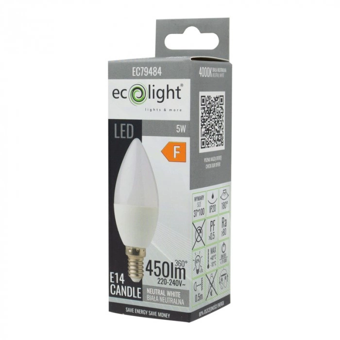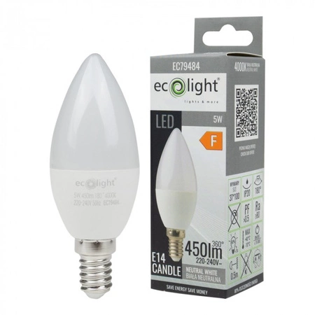 Představujeme žárovku LED Candle B37 E14 5W 450lm 4000K od společnosti ECO LIGHT - dokonalé řešení, které kombinuje energetickou účinnost s elegantním designem. Se jmenovitým příkonem 5 W a světelným tokem 450 lm poskytuje tato žárovka vynikající osvětlení při spotřebě pouhé 1/10 energie ve srovnání s tradičními světelnými zdroji. Její neutrální bílá barva 4000 K vytváří příjemnou atmosféru v každé místnosti, ideální pro práci i odpočinek.