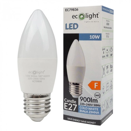 Objevte novou úroveň osvětlení s žárovkou LED Ecolight Candle B37 E27. Tato moderní 10W žárovka nabízí působivý světelný tok 900 lm - ideální pro vytvoření jasné a čisté atmosféry v každé místnosti. Díky vysoké světelné účinnosti 90lm/W je úsporná a šetrná k životnímu prostředí, což z ní činí vynikající volbu pro každou domácnost nebo kancelář. Vyzařuje studenou bílou barvu světla s barevnou teplotou 6500 K pro maximální ostrost a jasnost.