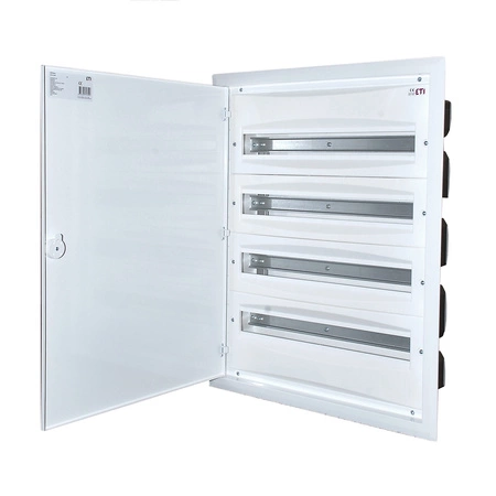 Vysokokapacitní modulární rozváděč pro zapuštěnou montáž s 96 moduly (4 řady po 24), určený pro instalace se jmenovitým proudem až 100 A. Je vybaven kovovými dvířky a bílým plastovým krytem a poskytuje vysokou úroveň zabezpečení a odolnosti. Splňuje normy IP40 a třídy ochrany II.