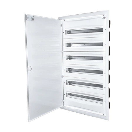 Modulární rozváděč pro zapuštěnou montáž s kapacitou 144 modulů (6 řad po 24), vhodný pro instalace 400 V, 100 A. Má kovová dvířka a bílý kryt z odolného plastu, který zajišťuje bezpečnost a odolnost. Splňuje normy IP40 a třídy ochrany II.