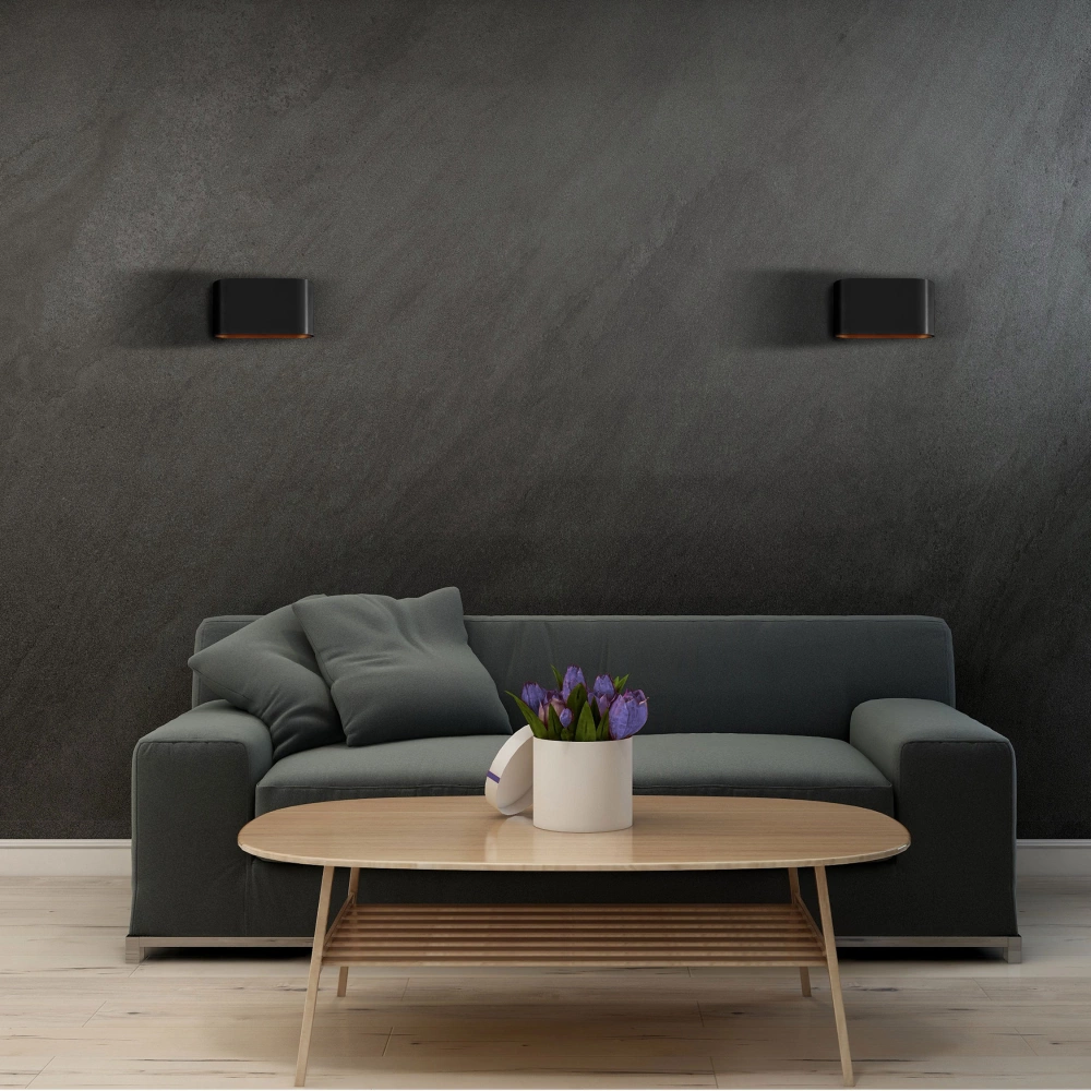 - Stylové osvětlení: Zlatý vnitřek nástěnné lampy dodává vyzařovanému světlu teplejší odstín, čímž interiéru dodává jedinečný nádech.